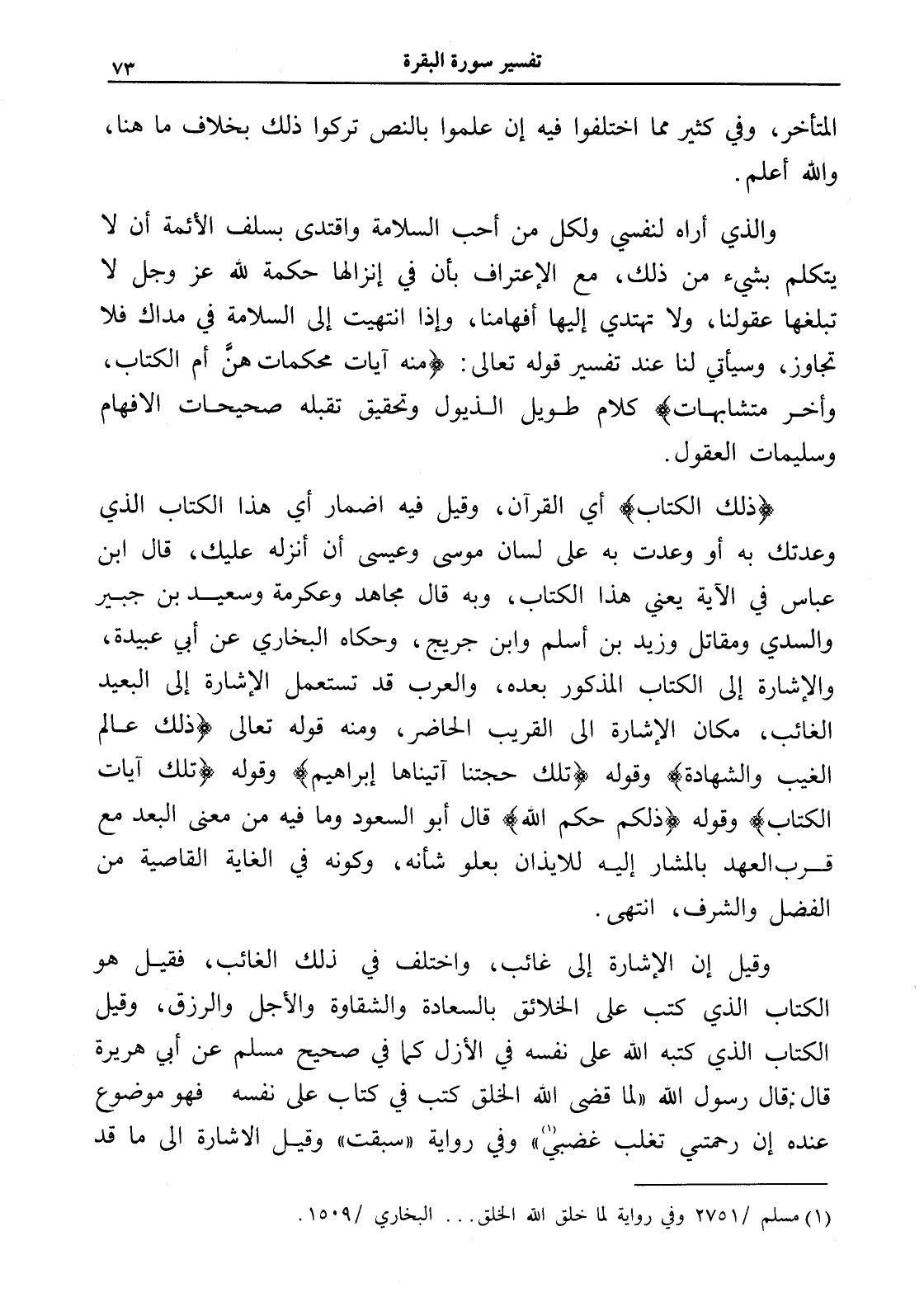 وقيل إن الإشارة إلى غائب، واختلف في ذلك الغائب، فقيل هو الكتاب الذي كتب على الخلائق بالسعادة والشقاوة والأجل والرزق، وقيل الكتاب الذي كتبه الله على نفسه في الأزل كما في صحيح مسلم عن أبي هريرة قال: قال رسول الله " لما قضى الله الخلق كتب في كتاب على نفسه فهو موضوع عنده إن رحمتي تغلب غضبي (¬1) " وفي رواية " سبقت " وقيل الإشارة إلى ما قد