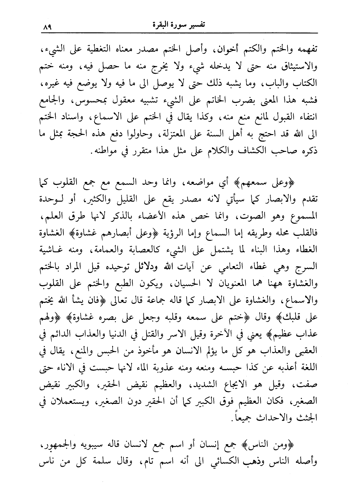تفهمه والختم والكتم أخوان، وأصل الختم مصدر معناه التغطية على الشيء، والاستيثاق منه حتى لا يدخله شيء ولا يخرج منه ما حصل فيه، ومنه ختم الكتاب والباب، وما يشبه ذلك حتى لا يوصل إلى ما فيه ولا يوضع فيه غيره، فشبه هذا المعنى بضرب الخاتم على الشيء تشبيه معقول بمحسوس، والجامع انتفاء القبول لمانع منع منه، وكذا يقال في الختم على الإسماع، وإسناد الختم إلى الله قد احتج به أهل السنة على المعتزلة، وحاولوا دفع هذه الحجة بمثل ما ذكره صاحب الكشاف والكلام على مثل هذا متقرر في مواطنه.