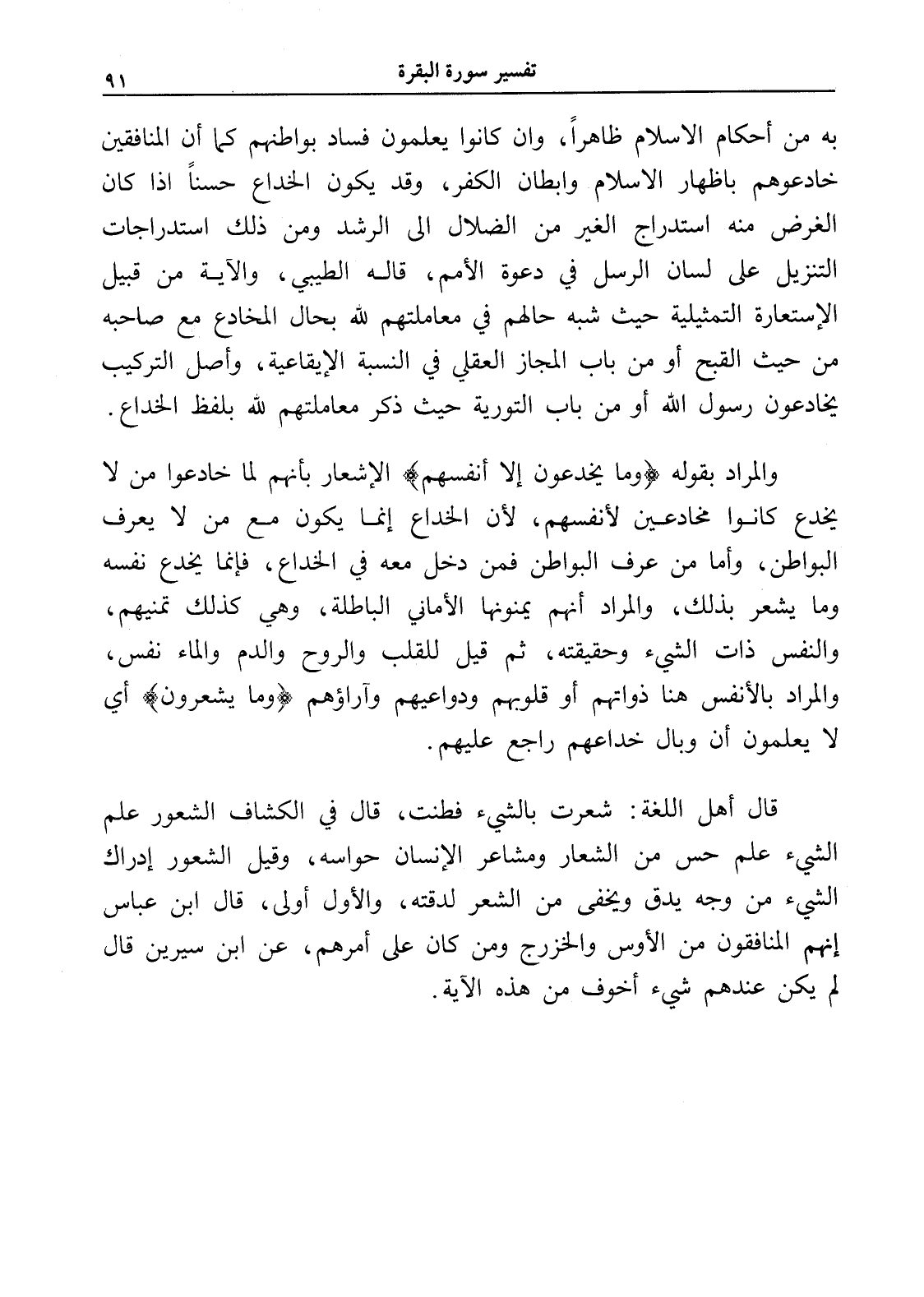 والمراد بقوله (وما يخدعون إلا أنفسهم) الإشعار بأنهم لما خادعوا من لا يخدع كانوا مخادعين لأنفسهم، لأن الخداع إنما يكون مع من لا يعرف البواطن، وأما من عرف البواطن فمن دخل معه في الخداع، فإنما يخدع نفسه وما يشعر بذلك، والمراد أنهم يمنونها الأماني الباطلة، وهي كذلك تمنيهم، والنفس ذات الشيء وحقيقته، ثم قيل للقلب والروح والدم والماء نفس، والمراد بالأنفس هنا ذواتهم أو قلوبهم ودواعيهم وآراؤهم (وما يشعرون) أي لا يعلمون أن وبال خداعهم راجع عليهم.