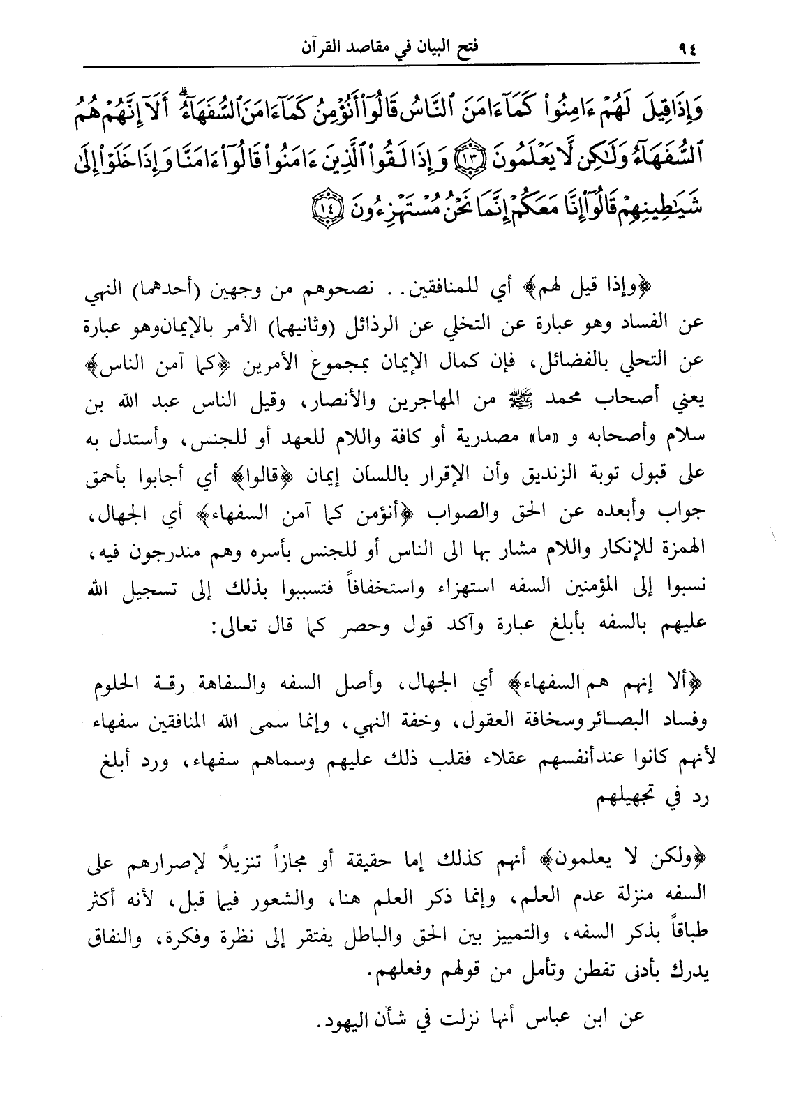 وَإِذَا قِيلَ لَهُمْ آَمِنُوا كَمَا آَمَنَ النَّاسُ قَالُوا أَنُؤْمِنُ كَمَا آَمَنَ السُّفَهَاءُ أَلَا إِنَّهُمْ هُمُ السُّفَهَاءُ وَلَكِنْ لَا يَعْلَمُونَ (13) وَإِذَا لَقُوا الَّذِينَ آَمَنُوا قَالُوا آَمَنَّا وَإِذَا خَلَوْا إِلَى شَيَاطِينِهِمْ قَالُوا إِنَّا مَعَكُمْ إِنَّمَا نَحْنُ مُسْتَهْزِئُونَ (14)