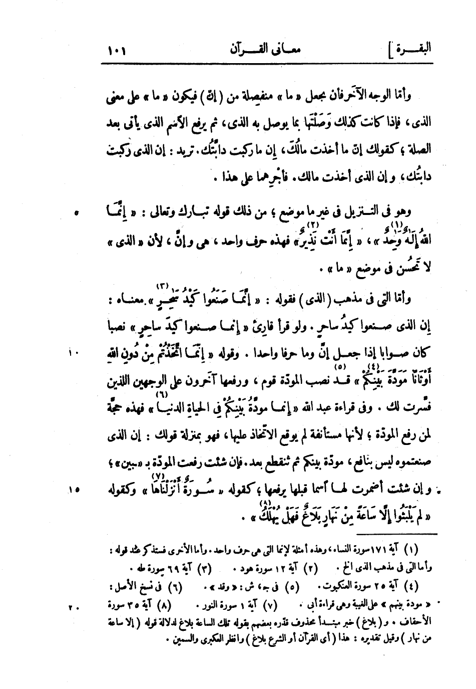 إن الذي صنعوا كيد ساحرٍ. ولو قرأ قارئ «إِنَّما صَنَعُوا كَيْدُ ساحِرٍ» نصبا كان صوابا إذا جعل إن وما حرفا واحدا. وقوله «إِنَّمَا اتَّخَذْتُمْ مِنْ دُونِ اللَّهِ أَوْثاناً مَوَدَّةَ بَيْنِكُمْ» «4» قد «5» نصب المودة قوم، ورفعها آخرون على الوجهين اللذين فسرت لك. وَفِي قراءة عَبْد اللَّه «إنّما مَوَدَّةُ بَيْنِكم فِي الحياة الدنيا» «6» فهذه حجة لمن رفع المودة لأنها مستأنفة لم يوقع الاتخاذ عليها، فهو بمنزلة قولك: إن الَّذِي صنعتموه ليس بنافع، مودة بينكم ثُمَّ تنقطع بعد. فإن شئت رفعت المودة ب «بين» وإن شئت أضمرت لها اسما قبلها يرفعها كقوله «سُورَةٌ أَنْزَلْناها» «7» وكقوله «لَمْ يَلْبَثُوا إِلَّا ساعَةً مِنْ نَهارٍ بَلاغٌ فَهَلْ يُهْلَكُ» «8» .