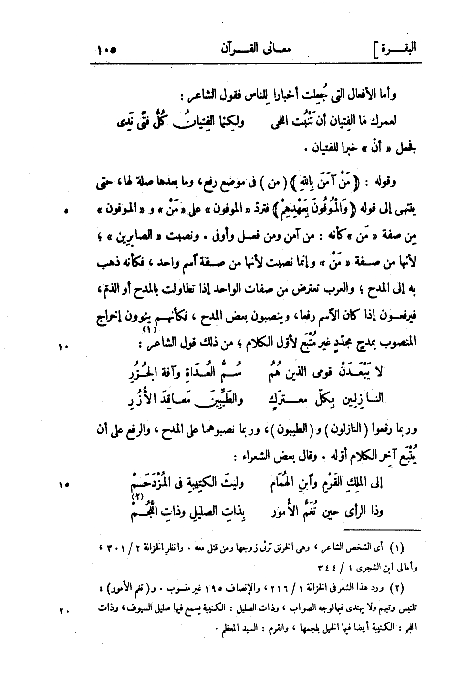 وقوله: مَنْ آمَنَ بِاللَّهِ (من) فِي موضع رفع، وما بعدها صلة لها، حتى ينتهى إلى قوله وَالْمُوفُونَ بِعَهْدِهِمْ فتردّ «الْمُوفُونَ» على «مَنْ» و «الْمُوفُونَ» من صفة «مَنْ» كأنه: من آمن ومن فعل وأوفى. ونصبت «الصَّابِرِينَ» لأنها من صفة «مَنْ» وإنما نصبت لأنها من صفة اسم واحد، فكأنه ذهب به إلى المدح والعرب تعترض من صفات الواحد إذا تطاولت بالمدح أو الذم، فيرفعون إذا كان الاسم رفعا، وينصبون بعض المدح، فكأنهم ينوون إخراج المنصوب بمدحٍ مجددٍ غير متبع لأول الكلام من ذلك قول الشاعر «1» :