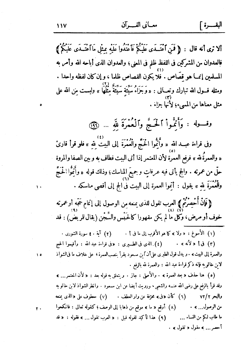 وفي قراءة عَبْد اللَّه «وَأَتِمُّوا الْحَجَّ وَالْعُمْرَةَ إلى البيت لله» «4» فلو قرأ قارئ «وَالْعُمْرَةَ لِلَّهِ» فرفع العمرة «5» لأن المعتمر إذا أتى البيت فطاف به وبين الصفا والمروة حل من عمرته. والحج يأتي فِيهِ عرفاتٍ وجميع المناسك وذلك قوله «وَأَتِمُّوا الْحَجَّ وَالْعُمْرَةَ لِلَّهِ» يقول: أتموا العمرة إلى البيت «6» فِي الحج إلى أقصى مناسكه.