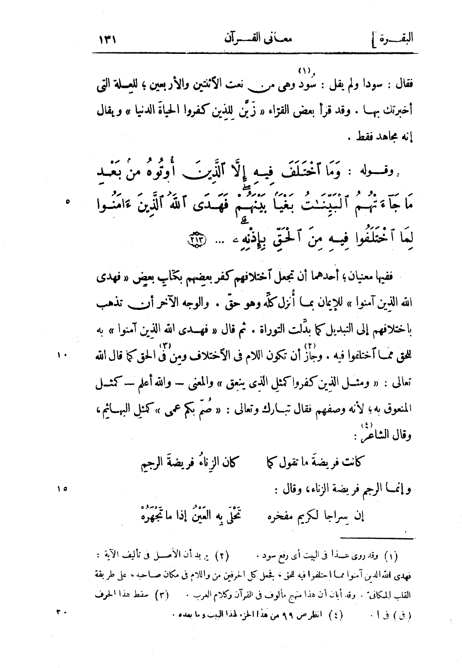 ففيها معنيان أحدهما أن تجعل اختلافهم كفر بعضهم بكتاب بعضٍ «فَهَدَى اللَّهُ الَّذِينَ آمَنُوا» للإيمان بما أنزل كله وهو حق. والوجه الآخر أن تذهب باختلافهم إلى التبديل كما بدلت التوراة. ثُمَّ قال «فَهَدَى اللَّهُ الَّذِينَ آمَنُوا» به للحق مما اختلفوا فِيهِ. وجاز «2» أن تكون اللام فِي الاختلاف ومن فِي «3» الحق كما قال اللَّه تعالى: «وَمَثَلُ الَّذِينَ كَفَرُوا كَمَثَلِ الَّذِي يَنْعِقُ» والمعنى- والله أعلم- كمثل المنعوق به لأنه وصفهم فقال تبارك وتعالى: «صُمٌّ بُكْمٌ عُمْيٌ» كمثل البهائم، وقال الشاعر «4» :