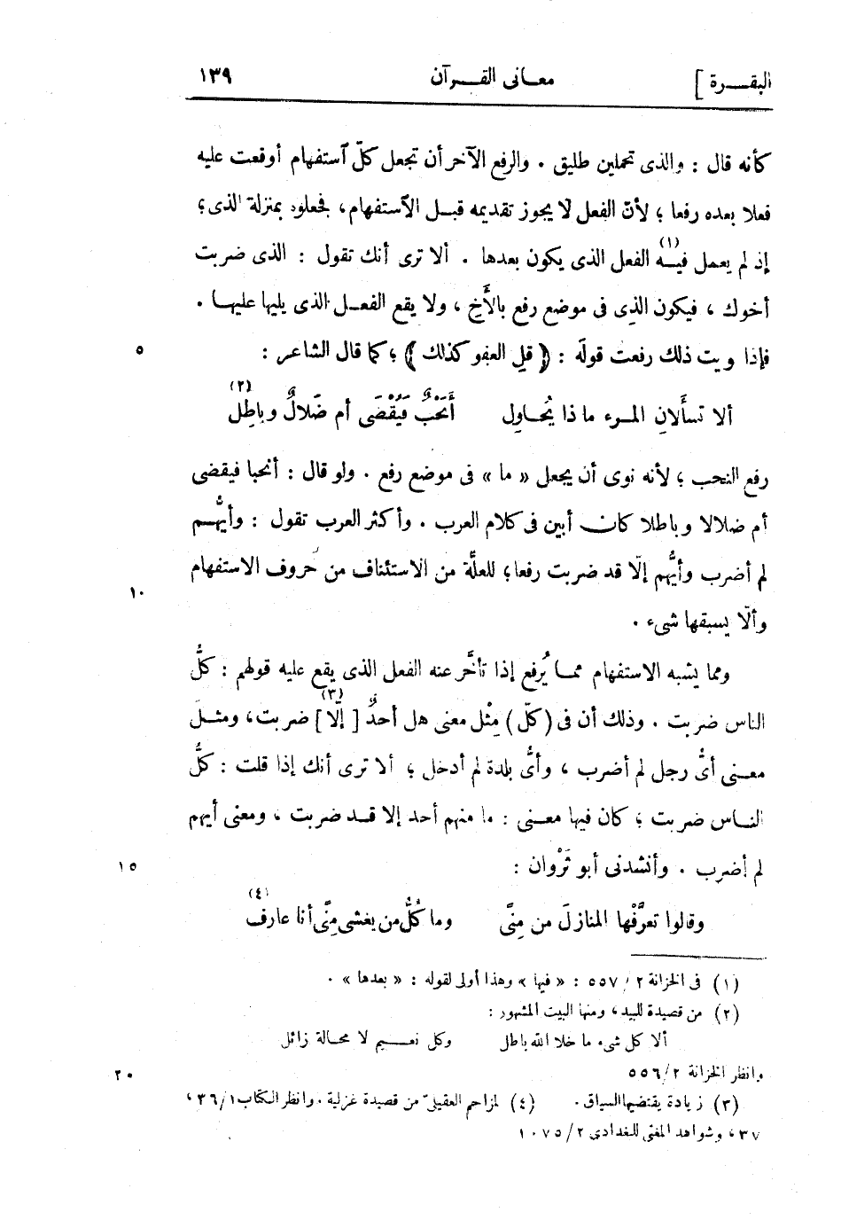 ومما يشبه الاستفهام مما يرفع إذا تأخر عَنْهُ الفعل الَّذِي يقع عليه قولهم: كل الناس ضربت. وذلك أن فِي (كل) مثل معنى هَلْ أحد [إلا] «3» ضربت، ومثل معنى أي رَجُل لم أضرب، وأي بلدة لم أدخل ألا ترى أنك إذا قلت: كل الناس ضربت كان فيها معنى: ما منهم أحد إلا قد ضربت، ومعنى أيهم لم أضرب. وأنشدني أَبُو ثروان: