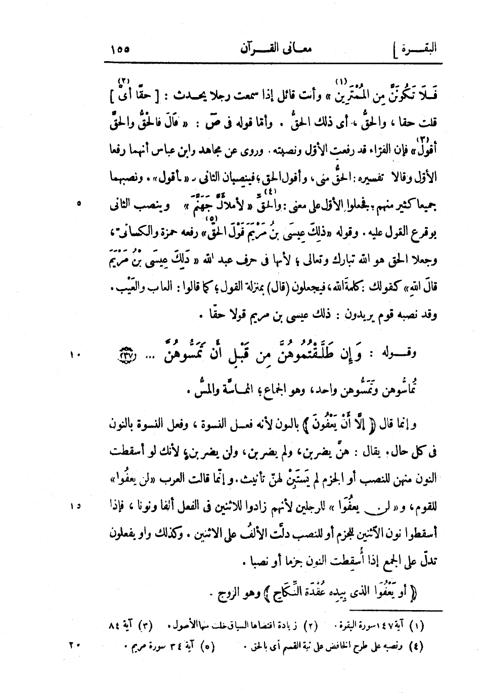 وإنما قال إِلَّا أَنْ يَعْفُونَ بالنون لأنه فعل النسوة، وفعل النسوة بالنون فِي كل حال. يقال: هن يضربن، ولم يضربن، ولن يضربن لأنك لو أسقطت النون منهن للنصب أو الجزم لم يستبن لهن تأنيث. وإنما قَالَتِ العرب «لن يعفوا» للقوم، و «لن يعفوا» للرجلين لانهم زادوا للاثنين فِي الفعل ألفا ونونا، فإذا أسقطوا نون الاثنين للجزم أو للنصب دلت الألف على الاثنين. وكذلك واو يفعلون تدل على الجمع إذا أسقطت النون جزما أو نصبا.