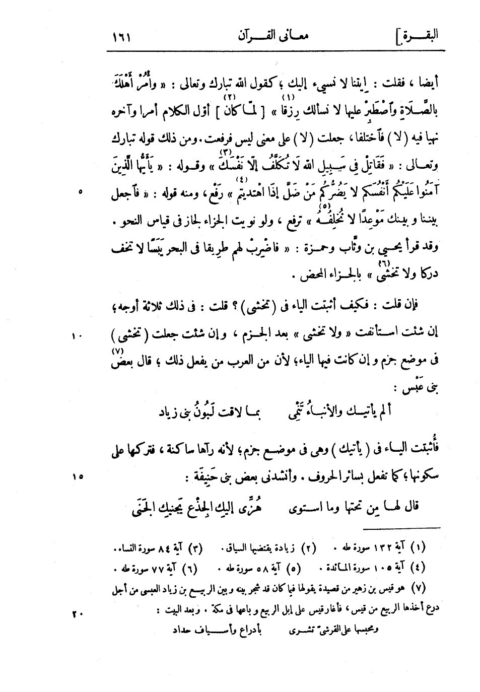 فإن قلت: فكيف أثبتت الياء فِي (تخشى) ؟ قلت: فِي ذلك ثلاثة أوجه إن شئت استأنفت «وَلا تَخْشى» بعد الجزم، وإن شئت جعلت (تخشى) فِي موضع جزم وإن كانت فيها الياء لأن من العرب من يفعل ذلك قال بعض «7» بني عبس: