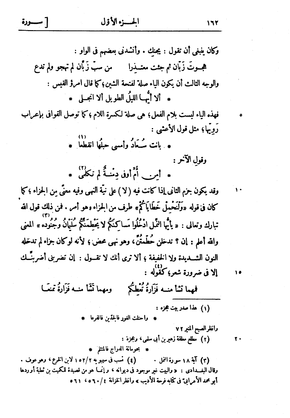 وقد يكون جزم الثاني إذا كانت فِيهِ (لا) على نية النهي وفيه معنى من الجزاء كما كان فى قوله «وَلْنَحْمِلْ خَطاياكُمْ» طرف من الجزاء وهو أمر. فمن ذلك قول الله تبارك وتعالى: «يا أَيُّهَا النَّمْلُ ادْخُلُوا مَساكِنَكُمْ لا يَحْطِمَنَّكُمْ سُلَيْمانُ وَجُنُودُهُ» «3» المعنى والله أعلم: إن؟ تدخلن حطمتن، وهو نهي محض لأنه لو كان جزاء لم تدخله النون الشديدة ولا الخفيفة ألا ترى أنك لا تقول: إن تضربني أضربنك إلا فِي ضرورة شعر كقوله «4» :