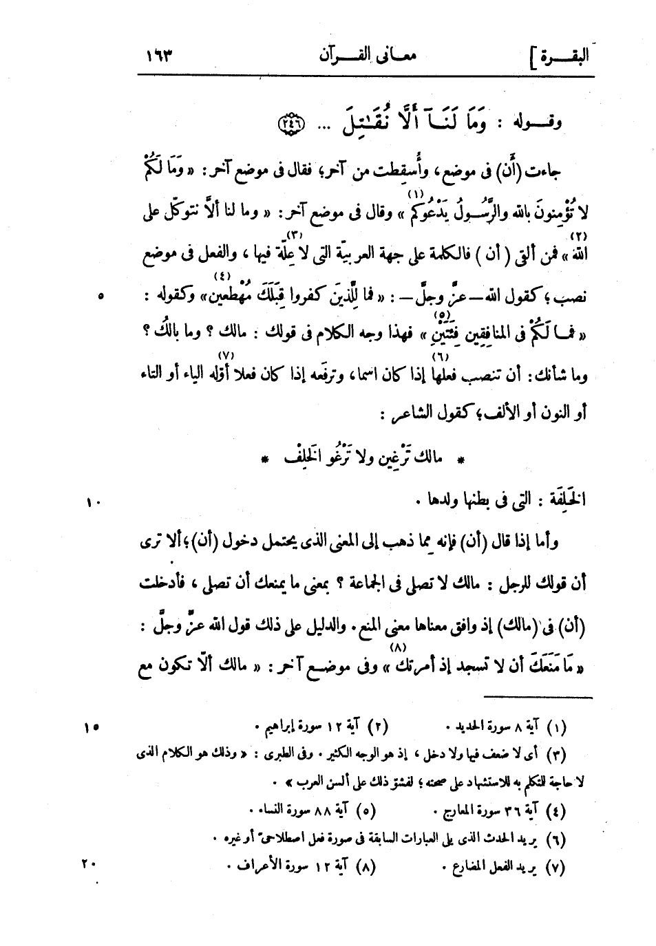 وأما إذا قال (أن) فإنه مما ذهب إلى المعنى الَّذِي يحتمل دخول (أن) ألا ترى أن قولك للرجل: مالك لا تصلي فِي الجماعة؟ بمعنى ما يمنعك أن تصلي، فأدخلت (أن) فى (مالك) إذ وافق معناها معنى المنع. والدليل على ذلك قول اللَّه عز وجل: