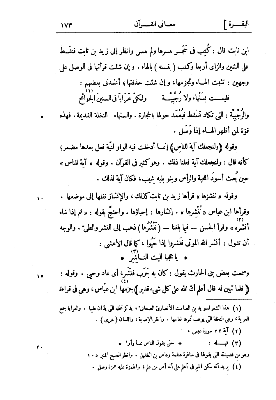 ابن ثابت قال: كتب فى حجر؟؟؟ ها ولم؟؟؟ وَانْظُرْ إِلَى زَيْدِ بْنِ ثَابِتٍ فَنَقَطَ عَلَى الشِّينِ وَالزَّايِ أَرْبَعًا وَكَتَبَ (يَتَسَنَّهْ) بِالْهَاءِ. وإن شئت قرأتها فِي الوصل على وجهين: تثبت الهاء وتجزمها، وإن شئت حذفتها أنشدني بعضهم: