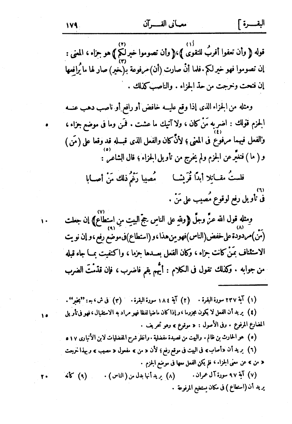 (6) يريد أن «أصاب» فى البيت فى موقع رفع لأن «من» مفعول «مصيب» وبهذا خرجت «من» عن معنى الجزاء، فلم يكن الفعل معها فى موضع الجزم.
