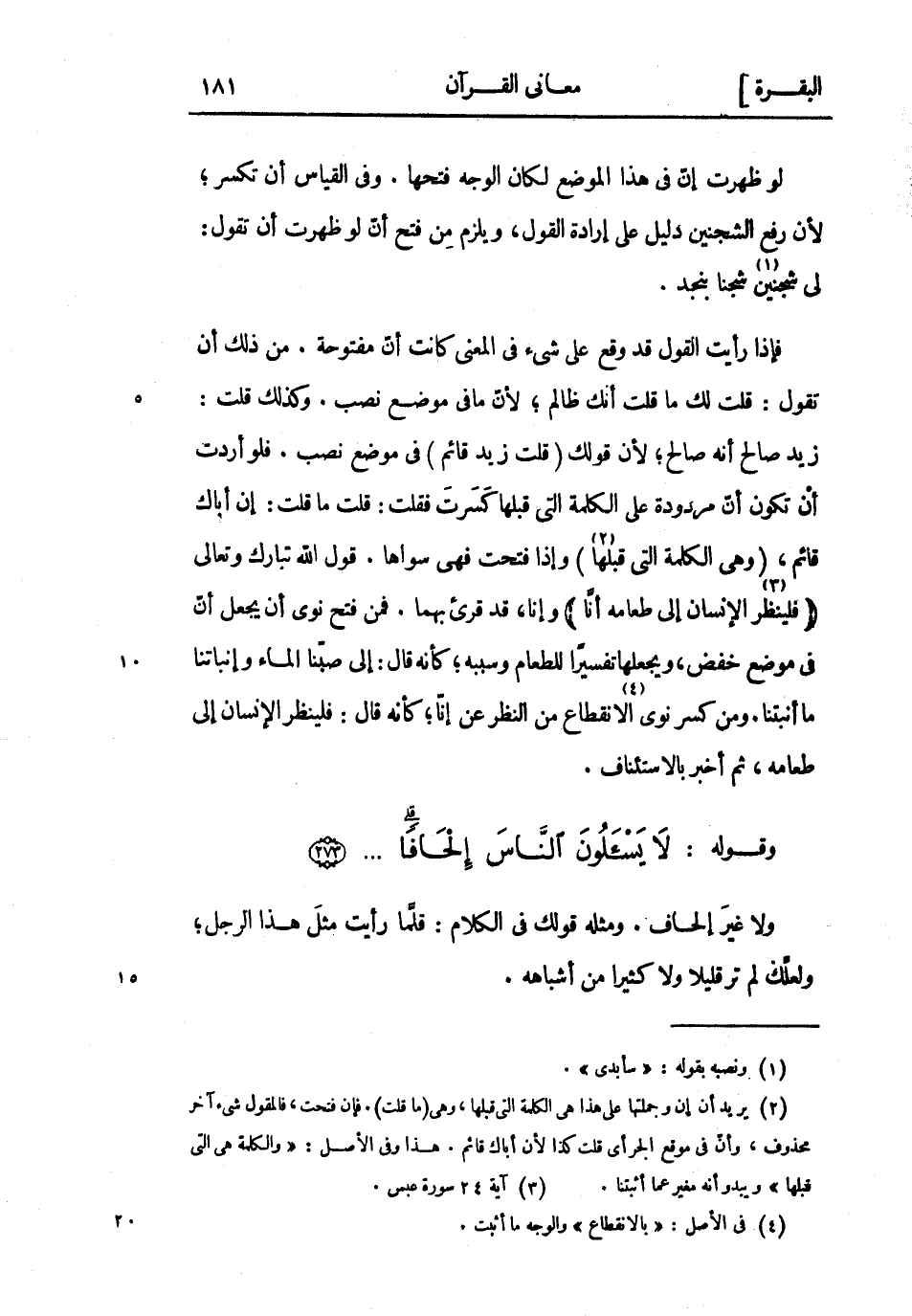 زَيْدُ صالح أنه صالح لأن قولك (قلت زَيْدُ قائم) فِي موضع نصب. فلو أردت أن تكون أن مردودة على الكلمة التي قبلها كسرت فقلت: قلت ما قلت: إن أباك قائم، (وهي الكلمة التي قبلها) «2» وإذا فتحت فهي سواها. قول اللَّه تبارك وتعالى فَلْيَنْظُرِ الْإِنْسانُ إِلى طَعامِهِ أَنَّا «3» وإنا، قد قرئ بهما. فمن فتح نوى أن يجعل أن فِي موضع خفض، ويجعلها تفسيرًا للطعام وسببه كأنه قال: إلى صبنا الماء وإنباتنا ما أنبتنا. ومن كسر نوى الانقطاع «4» من النظر عن إنا كأنه قال: فلينظر الانْسَان إلى طعامه، ثُمَّ أخبر بالاستئناف.