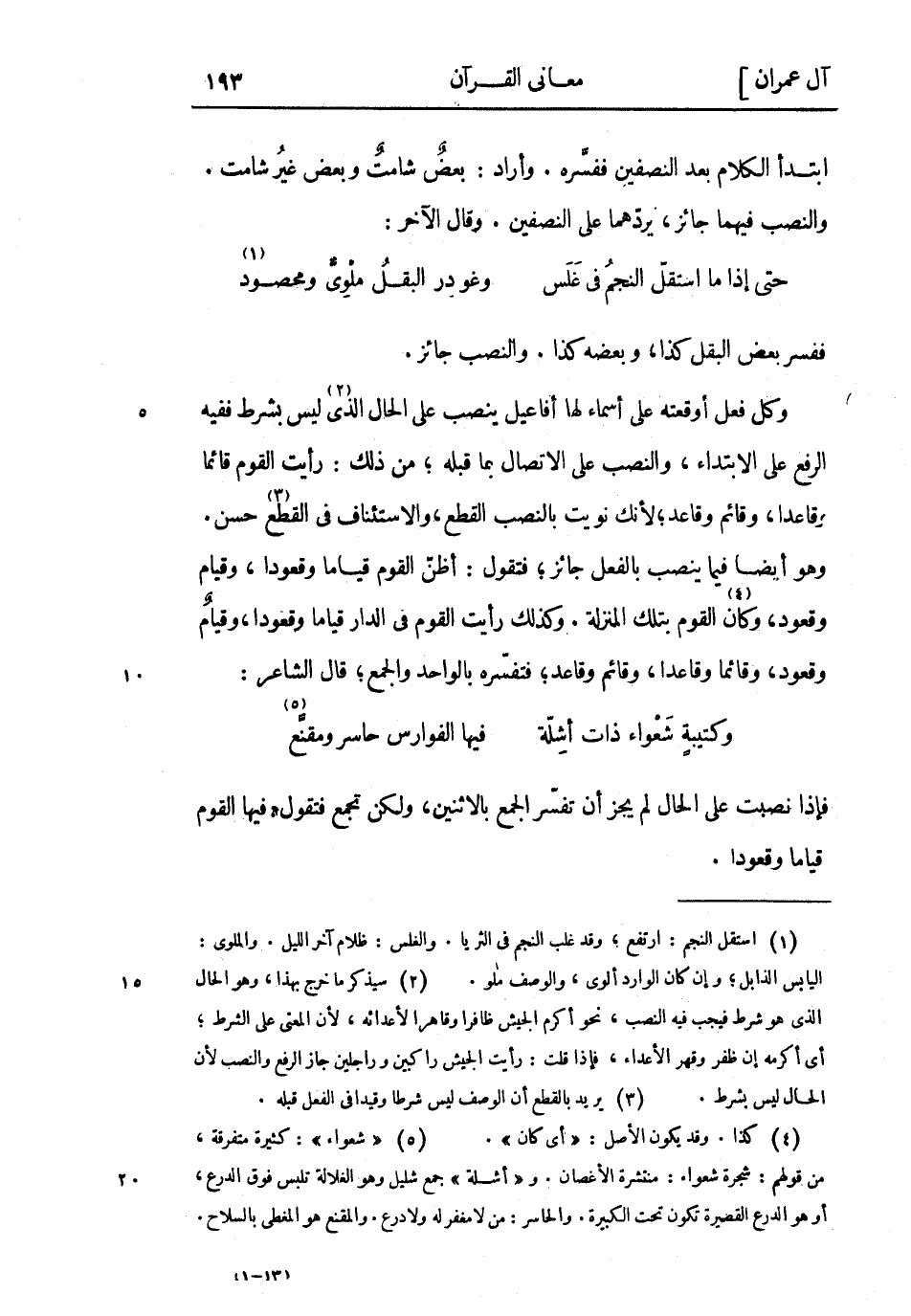 وكل فعل أوقعته على أسماء لها أفاعيل ينصب على الحال الَّذِي «2» ليس بشرط ففيه الرفع على الابتداء، والنصب على الاتصال بما قبله من ذلك: رَأَيْت القوم قائما وقاعدا، وقائم وقاعد لأنك نويت بالنصب القطع، والاستئناف فِي القطع «3» حسن.