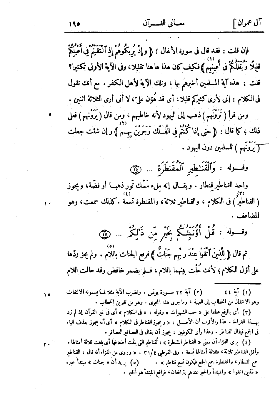 (4) يرى الفرّاء أن معنى «القناطر المقنطرة» : القناطير التي بلغت أضعافها أي بلغت ثلاثة أمثالها.