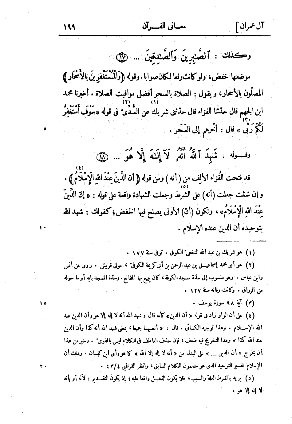 موضعها خفض، ولو كانت رفعا لكان صوابا. وقوله وَالْمُسْتَغْفِرِينَ بِالْأَسْحارِ المصلون بالأسحار، ويقول: الصلاة بالسحر أفضل مواقيت الصلاة. أخبرنا محمد ابن الجهم قال حدثنا الفراء قال حَدَّثَنِي شريك «1» عن السدي «2» فِي قوله «سَوْفَ أَسْتَغْفِرُ لَكُمْ رَبِّي» «3» قال: أخرهم إلى السحر.