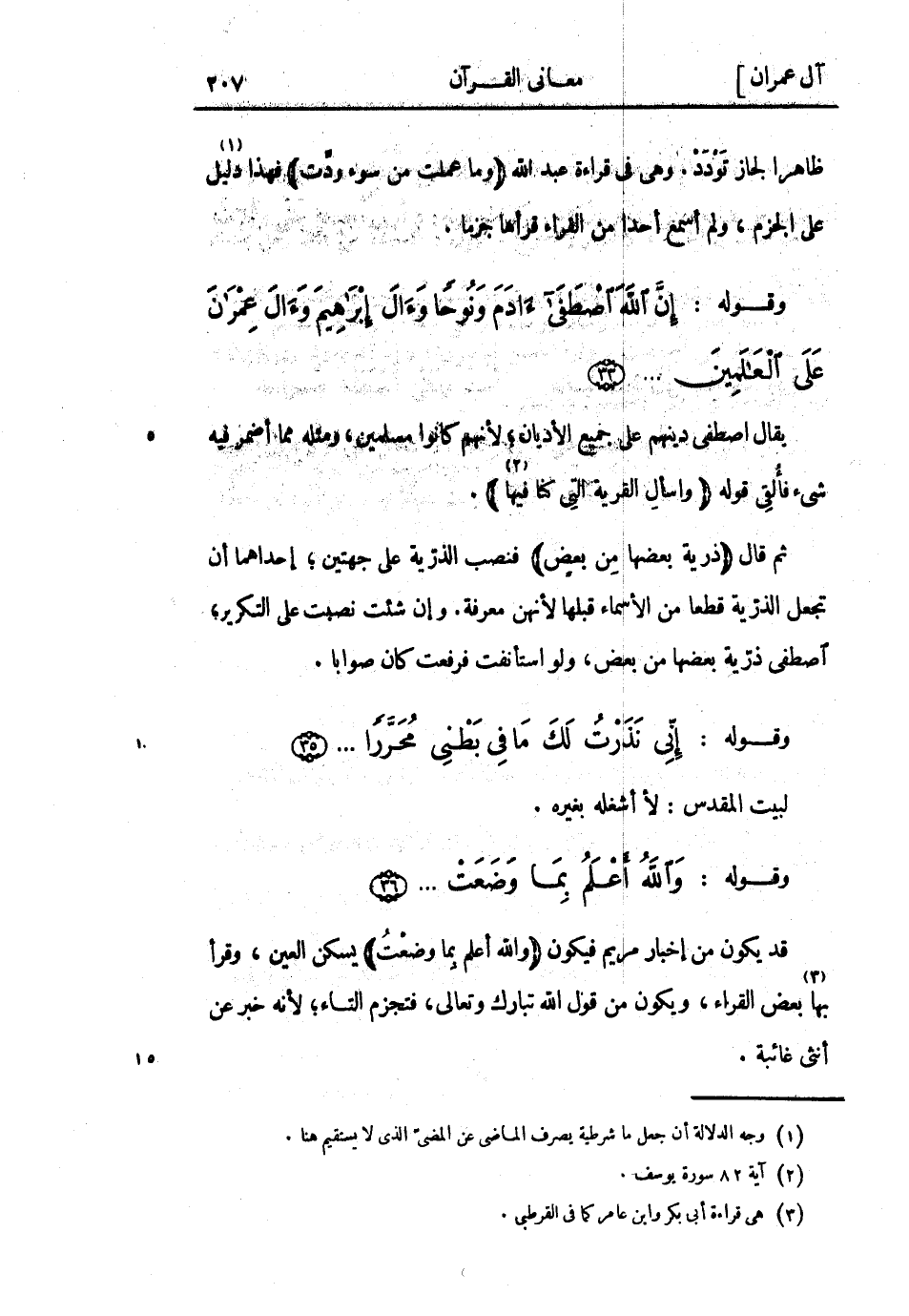 ثم قال ذُرِّيَّةً بَعْضُها مِنْ بَعْضٍ فنصب الذرية على جهتين إحداهما أن تجعل الذرية قطعا من الاسماء قبلها لانهن معرفة. وإن شئت نصبت على التكرير، اصطفى ذرية بعضها من بعض، ولو استأنفت فرفعت كان صوابا.
