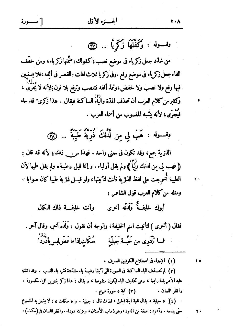 من شدد جعل زكرياء فِي موضع نصب كقولك: ضمنها زكرياء، ومن خفف الفاء جعل زكرياء فِي موضع رفع. وفي زكريا ثلاث لغات: القصر فى ألفه، فلا يستبين فيها رفع ولا نصب ولا خفض، وتمد ألفه فتنصب وترفع بلا نون لأنه لا يجرى «1» ، وكثير من كلام العرب أن تحذف المدة والياء «2» الساكنة فيقال: هذا زكرى قد حاء فيجرى لأنه يشبه المنسوب من أسماء العرب.