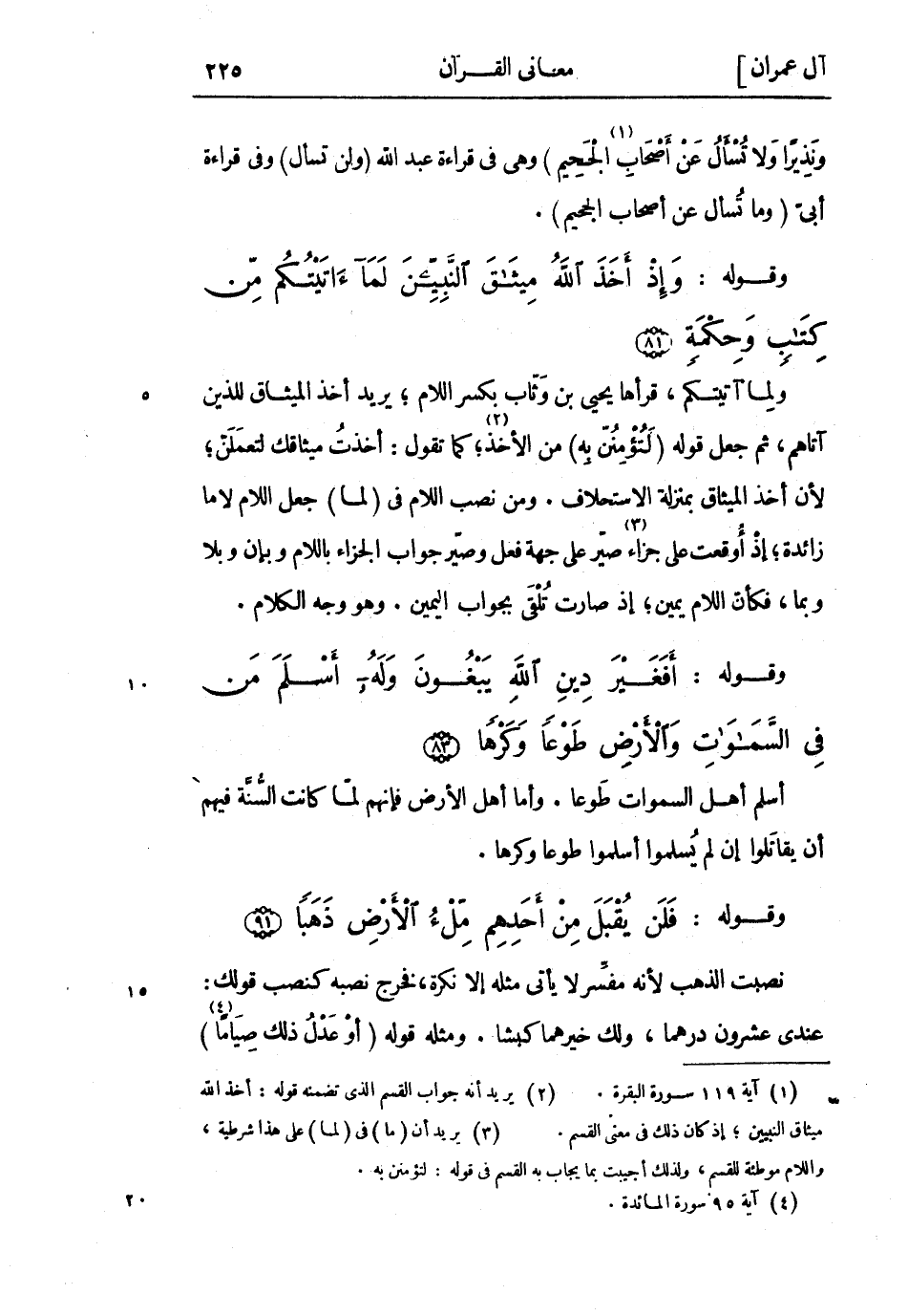 وقوله: وَإِذْ أَخَذَ اللَّهُ مِيثاقَ النَّبِيِّينَ لَما آتَيْتُكُمْ مِنْ كِتابٍ وَحِكْمَةٍ (81) ولما آتيتكم، قرأها يحيى بْن وثاب بكسر اللام يريد أخذ الميثاق للذين آتاهم، ثُمَّ جعل قوله (لتؤمنن به) من الأخذ «2» كما تقول: أخذت ميثاقك لتعملن لأن أخذ الميثاق بمنزلة الاستحلاف. ومن نصب اللام فِي (لما) جعل اللام لا ما زائدة إذ أوقعت على جزاء «3» صير على جهة فعل وصير جواب الجزاء باللام وبإن وبلا وبما، فكأن اللام يمين إذ صارت تلقى بجواب اليمين. وهو وجه الكلام.
