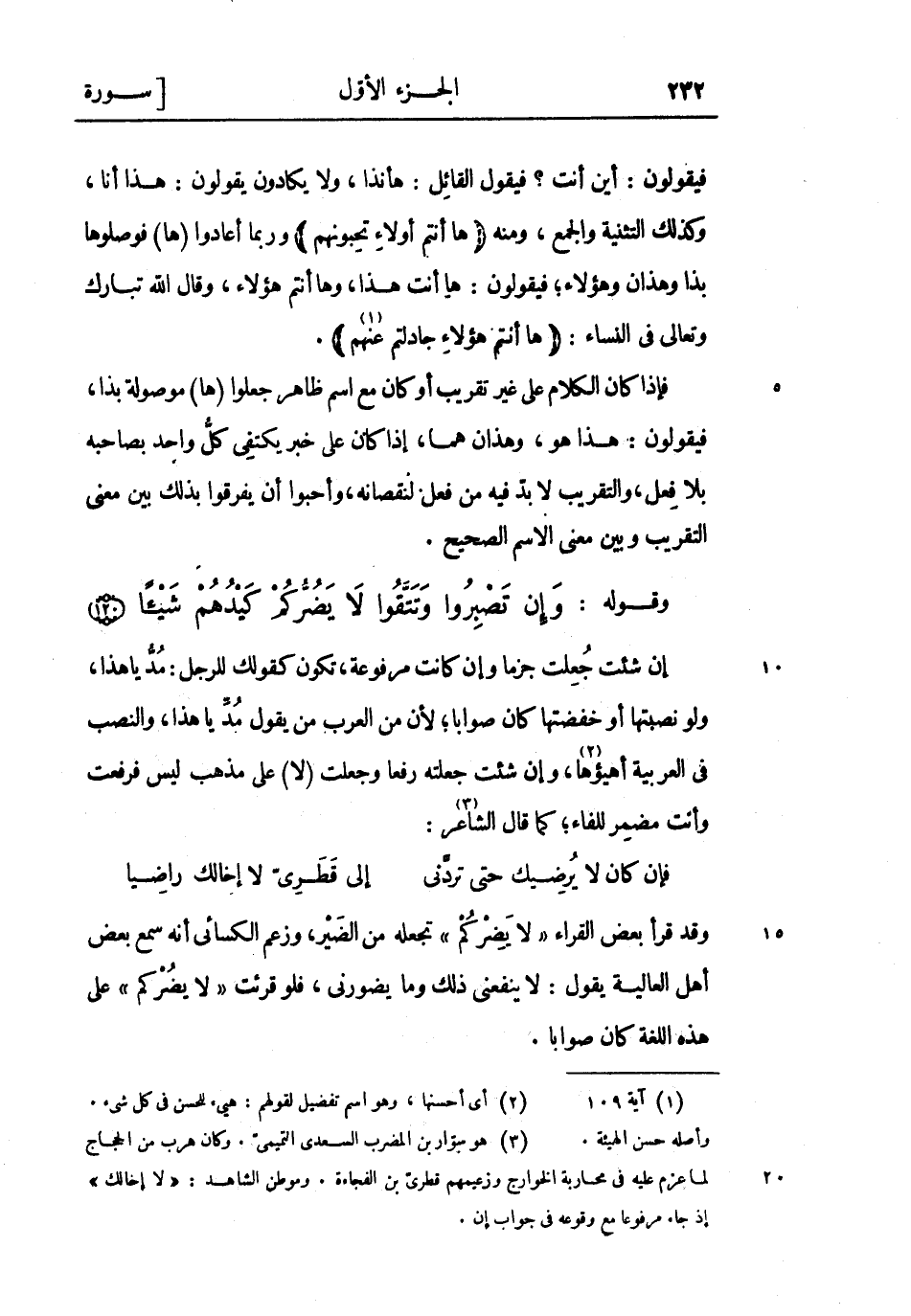 وقوله: وَإِنْ تَصْبِرُوا وَتَتَّقُوا لا يَضُرُّكُمْ كَيْدُهُمْ شَيْئاً (120) إن شئت جعلت جزما وإن كانت مرفوعة، تكون كقولك للرجل: مد يا هذا، ولو نصبتها أو خفضتها كان صوابا لأن من العرب من يقول مد يا هذا، والنصب فِي العربية أهيؤها «2» ، وإن شئت جعلته رفعا وجعلت (لا) على مذهب ليس فرفعت وأنت مضمر للفاء كما قال الشاعر «3» :