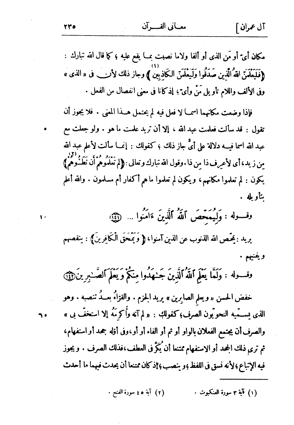 وقوله: وَلَمَّا يَعْلَمِ اللَّهُ الَّذِينَ جاهَدُوا مِنْكُمْ وَيَعْلَمَ الصَّابِرِينَ (142) خفض الْحَسَن «ويعلم الصابرين» يريد الجزم. والقراء بعد تنصبه. وهو الَّذِي يسميه النحويون الصرف كقولك: «لم آته وأكرمه إلا استخف بي» والصرف أن يجتمع الفعلان بالواو أو ثُمَّ أو الفاء أو أو، وفي أوله جحد أو استفهام، ثُمَّ ترى ذلك الجحد أو الاستفهام ممتنعا أن يكر فِي العطف، فذلك الصرف. ويجوز فِيهِ الاتباع لأنه نسق فِي اللفظ وينصب إذ كان ممتنعا أن يحدث فيهما ما أحدث