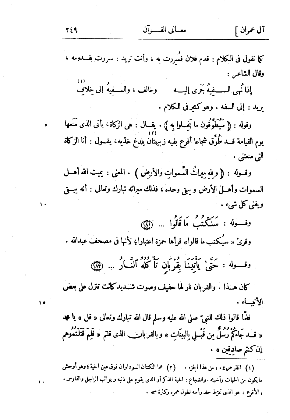 (2) هما النكتتان السوداوان فوق عين الحية وهو أوحش ما يكون من الحيات وأخبثه. والشجاع: الحية الذكر أو الذي يقوم على ذنبه ويواثب الراجل والفارس.