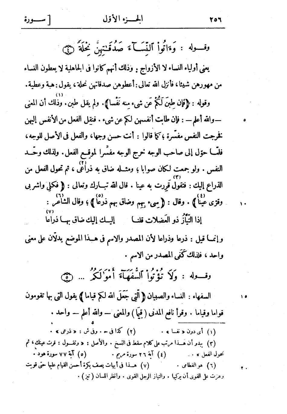 وقوله: فَإِنْ طِبْنَ لَكُمْ عَنْ شَيْءٍ مِنْهُ نَفْساً. ولم يقل طبن. وذلك «1» أن المعنى- والله أعلم-: فإن طابت أنفسهن لكم عن شيء. فنقل الفعل من الأنفس إليهن فخرجت النفس مفسّرة كما قالوا: أنت حسن وجها، والفعل في الاصل للوجه، فلما حول إلى صاحب الوجه خرج الوجه مفسرا لموقع الفعل. ولذلك وحد النفس. ولو جمعت لكان صوابا ومثله ضاق به ذراعي «2» ، ثُمَّ تحول الفعل من الذراع إليك: فتقول «3» قررت به عينا. قال اللَّه تبارك وتعالى: فَكُلِي وَاشْرَبِي وَقَرِّي عَيْناً «4» . وقال: سِيءَ بِهِمْ وَضاقَ بِهِمْ ذَرْعاً «5» وقال الشاعر «6» :