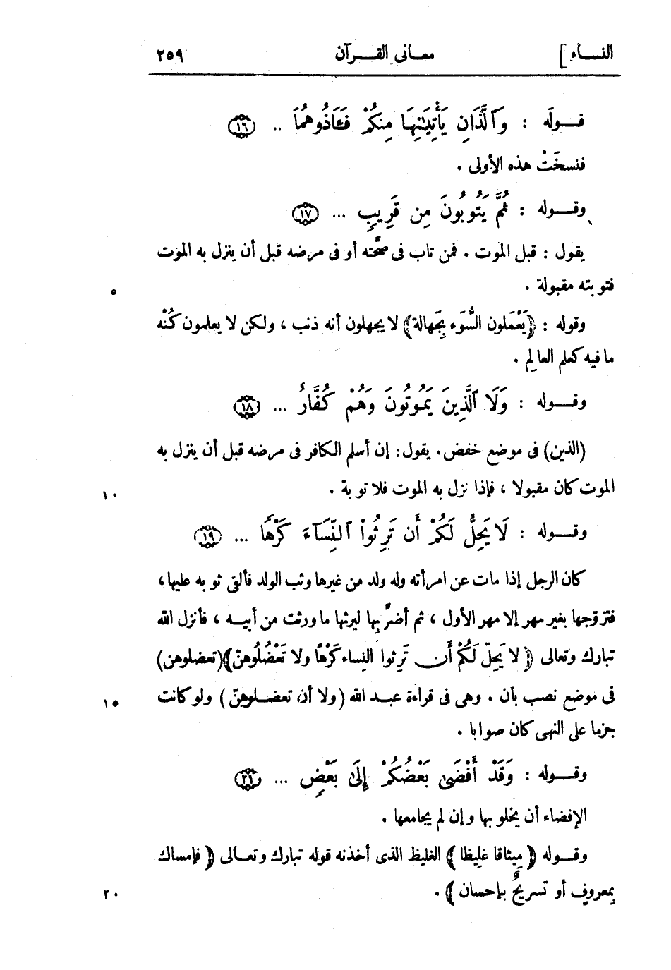 كان الرجل إذا مات عن امرأته وله ولد من غيرها وثب الولد فألقى ثوبه عليها، فتزوجها بغير مهر إلا مهر الأول، ثم أضرّ بها ليرثها ما ورثت من أَبِيهِ، فأنزل اللَّه تبارك وتعالى لا يَحِلُّ لَكُمْ أَنْ تَرِثُوا النِّساءَ كَرْهاً وَلا تَعْضُلُوهُنَّ (تعضلوهن) فِي موضع نصب بأن. وهي فِي قراءة عَبْد اللَّه (ولا أن تعضلوهن) ولو كانت جزما على النهى كان صوابا.