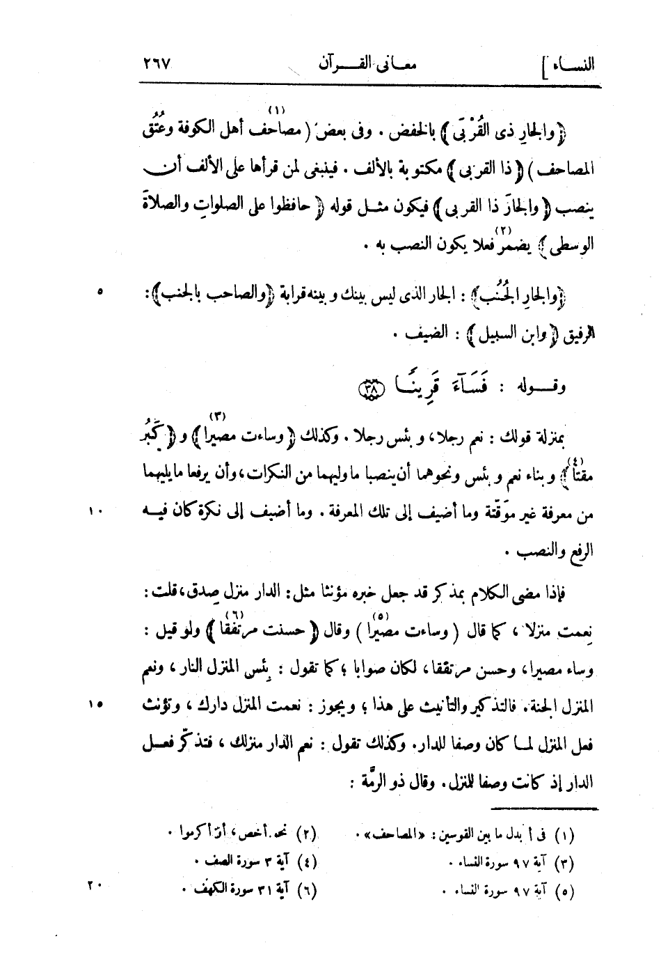 وَالْجارِ ذِي الْقُرْبى بالخفض. وفي بعض (مصاحف «1» أهل الكوفة وعتق المصاحف) ذا القربى مكتوبة بالألف. فينبغي لمن قرأها على الألف أن ينصب والجار ذا القربى فيكون مثل قوله حافِظُوا عَلَى الصَّلَواتِ وَالصَّلاةِ الْوُسْطى يضمر «2» فعلا يكون النصب به.