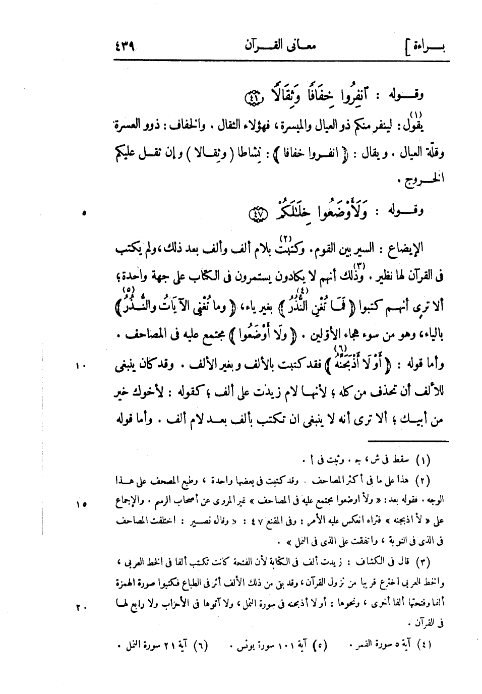 (2) هذا على ما فى أكثر المصاحف. وقد كتبت فى بعضها واحدة، وطبع المصحف على هذا الوجه. فقوله بعد: «ولأوضعوا مجتمع عليه فى المصاحف» غير المروي عن أصحاب الرسم. والإجماع على «لأ اذبجنه» فتراه انعكس عليه الأمر: وفى المقنع 47: «وقال نصير: اختلفت المصاحف فى الذي فى التوبة، واتفقت على الذي فى النمل» .