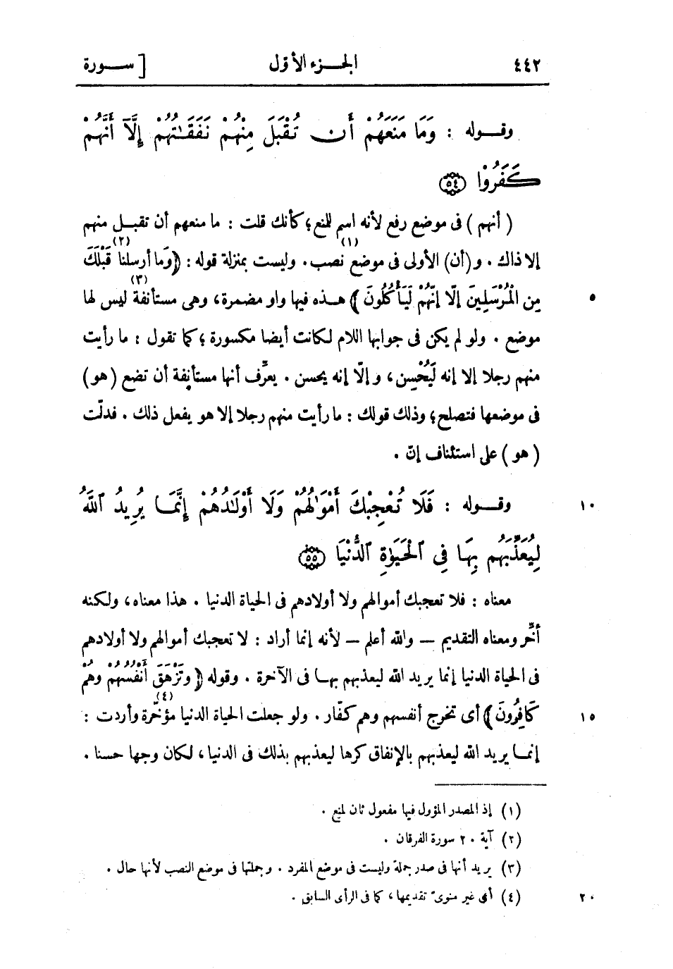 وقوله: وَما مَنَعَهُمْ أَنْ تُقْبَلَ مِنْهُمْ نَفَقاتُهُمْ إِلَّا أَنَّهُمْ كَفَرُوا (54) (أنهم) فِي موضع رفع لأنه اسم للمنع كأنك قلت: ما منعهم أن تقبل منهم إلا ذاك. و (أن) الأولى فِي موضع «1» نصب. وليست بمنزلة قوله: وَما أَرْسَلْنا «2» قَبْلَكَ مِنَ الْمُرْسَلِينَ إِلَّا إِنَّهُمْ لَيَأْكُلُونَ هَذِه فيها واو مضمرة، وهي مستأنفة «3» لَيْسَ لَهَا موضع. ولو لَمْ يكن فِي جوابها اللام لكانت أيضا مكسورة كما تَقُولُ: ما رأيت منهم رجلا إلا إنه لَيُحْسِن، وإلا إنه يحسن. يعرِّف أنها مستأنفة أن تضع (هُوَ) فِي موضعها فتصلح وَذَلِكَ قولك: ما رأيت منهم رجلا إلا هُوَ يفعل ذَلِكَ. فدلّت (هُوَ) عَلَى استئناف إنّ.