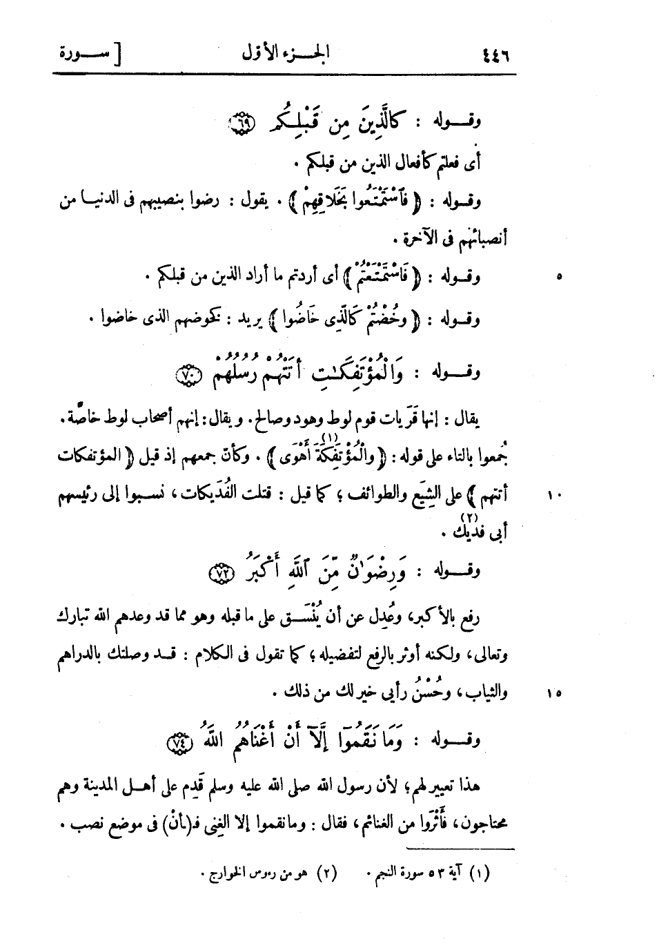 جُمعوا بالتاء عَلَى قوله: وَالْمُؤْتَفِكَةَ «1» أَهْوى. وكأنّ جمعهم إذ قيل الْمُؤْتَفِكاتِ أَتَتْهُمْ عَلَى الشِيع والطوائف كما قيل: قتلت الفُدَيكات، نسبوا إلى رئيسهم أبي فديك» .