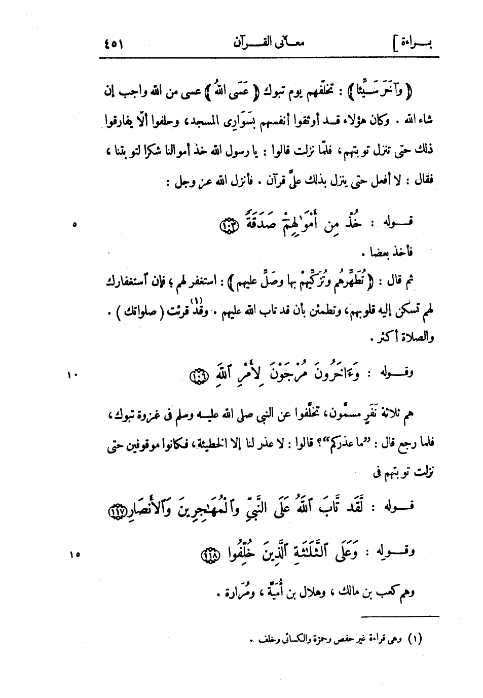 وقوله: وَآخَرُونَ مُرْجَوْنَ لِأَمْرِ اللَّهِ (106) هم ثلاثة نَفَرٍ مسمَّون، تخلّفوا عَن النَّبِيّ صَلَّى اللهُ عَلَيْهِ وَسَلَّمَ فِي غزوة تبوك، فلمّا رجع قَالَ: (ما عذركم) ؟ قالوا: لا عذر لنا إلا الخطيئة، فكانوا موقوفين حَتَّى نزلت توبتهم فِي قوله: لَقَدْ تابَ اللَّهُ عَلَى النَّبِيِّ وَالْمُهاجِرِينَ وَالْأَنْصارِ (117) وقوله: وَعَلَى الثَّلاثَةِ الَّذِينَ خُلِّفُوا (118) وهم كعب بن مالك، وهلال بن أُمَيَّة، ومرارة.