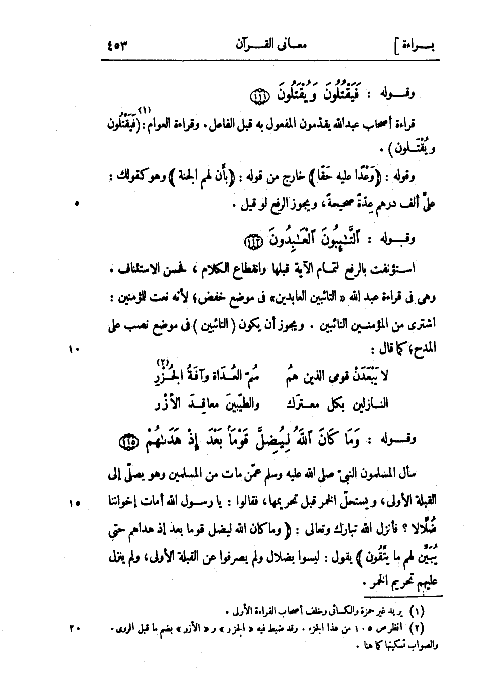وقوله: فَيَقْتُلُونَ وَيُقْتَلُونَ (111) قراءة أصحاب عبد الله يقدمون المفعول بِهِ قبل الفاعل. وقراءة العوام «1» : (فَيَقْتُلون ويُقتلون) .