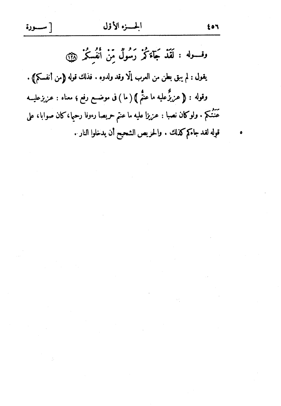 وقوله: عَزِيزٌ عَلَيْهِ ما عَنِتُّمْ (ما) فِي موضع رفع معناهُ: عزيز عَلَيْهِ عنتكم. ولو كَانَ نصبًا: عزيزًا عَلَيْهِ ما عنتم حريصًا رءوفًا رحيمًا، كَانَ صوابًا، عَلَى قوله لقد جاءكم كذلك. والحريص الشحيح أن يدخلوا النار.