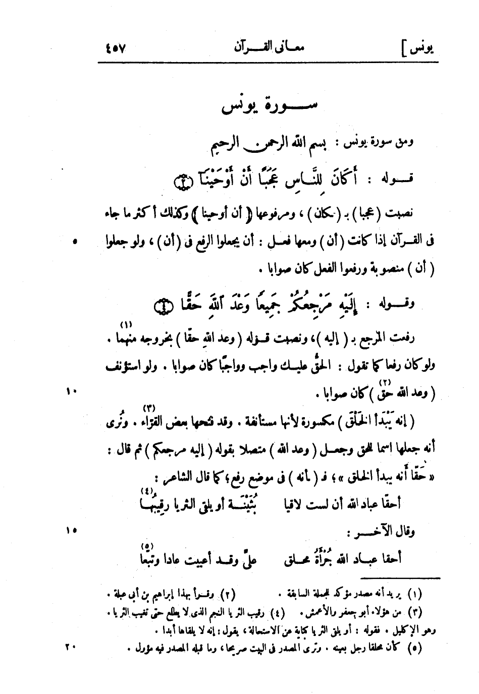 قوله: أَكانَ لِلنَّاسِ عَجَباً أَنْ أَوْحَيْنا (2) نصبت (عجبا) ب (كان) ، ومرفوعها أَنْ أَوْحَيْنا وكذلك أكثر ما جاء فِي القرآن إِذَا كانت (أن) ومعها فعل: أن يجعلوا الرفع فِي (أَنْ) ، ولو جعلوا (أَنْ) منصوبة ورفعوا الفعل كَانَ صوابًا.