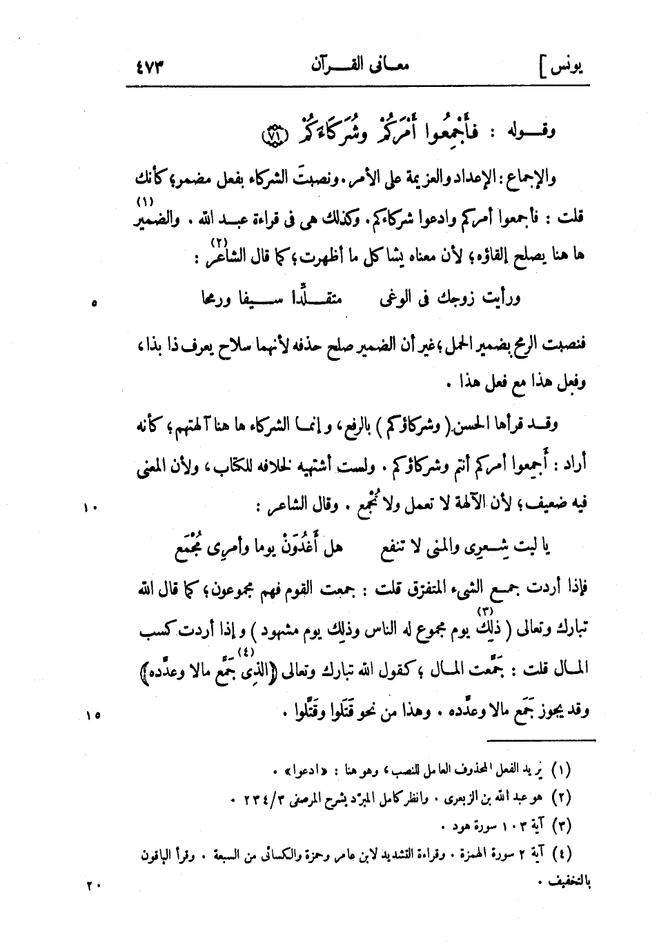 وقوله: فَأَجْمِعُوا أَمْرَكُمْ وَشُرَكاءَكُمْ (71) والإجماع: الإعداد والعزيمة عَلَى الأمر. ونصبت الشركاء بفعل مضمر كأنك قلت: فأجمعوا أمركم وادعوا شركاءكم. وكذلك هي فِي قراءة عبد الله. والضمير «1» هاهنا يصلح إلقاؤه لأن معناه يشا كل ما أظهرت كما قَالَ الشاعر «2» :