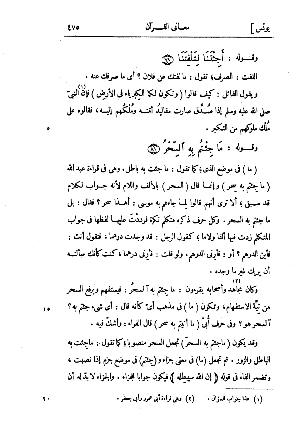 وقوله: مَا جِئْتُمْ بِهِ السِّحْرُ (81) (ما) فِي موضع الَّذِي كما تَقُولُ: ما جئت بِهِ باطل. وهي فِي قراءة عبد الله (ما جِئتم بِهِ سِحر) وإنما قال (السحر) بالألف واللام لأنه جواب لِكلام قد سبق ألا ترى أنهم قالوا لِما جاءهم بِهِ موسى: أهذا سحر؟ فقال: بَلْ ما جئتم بِهِ السحر. وكل حرف ذكره متكلم نكرة فرددْتَ عليها لفظها فِي جواب المتكلم زدت فيها ألفا ولاما كقول الرجل: قد وجدت درهمًا، فتقول أنت: