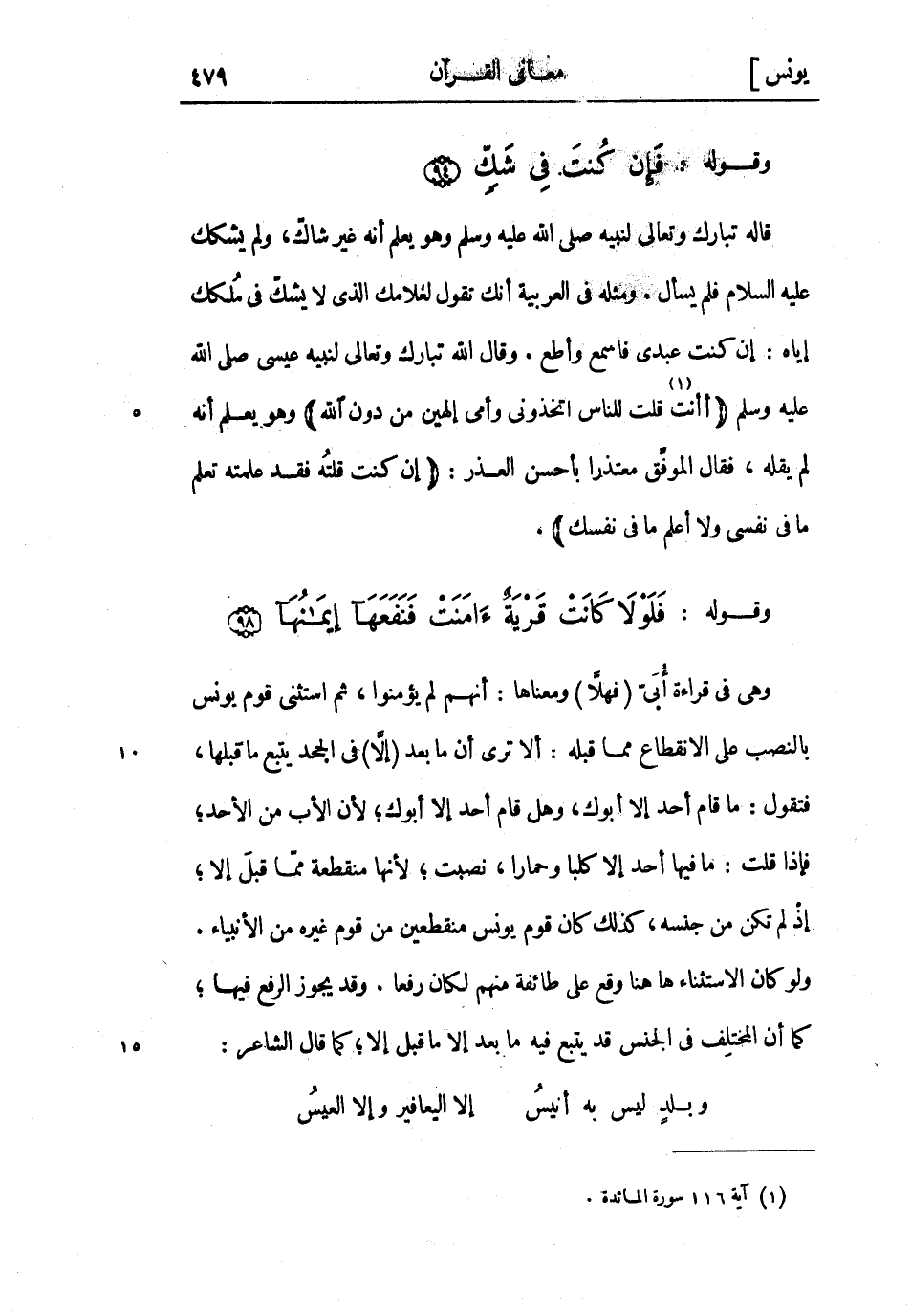 وقوله: فَلَوْلا كانَتْ قَرْيَةٌ آمَنَتْ فَنَفَعَها إِيمانُها (98) وهي فِي قراءة أُبَيّ (فهلا) ومعناها: أنهم لَمْ يؤمنوا، ثُمَّ استثنى قوم يونس بالنصب عَلَى الانقطاع مما قبله: ألا ترى أن ما بعد (إِلا) فِي الجحد يتبع ما قبلها، فتقول: ما قام أحد إلا أبوك، وهل قام أحد إلا أبوك لأن الأب من الاحد فإذا قلت: ما فيها أحد إلا كلبًا وحمارًا، نصبت لأنها منقطعة مما قبل إلا إذ لم تكن من جنسه، كذلك كان قوم يُونُس منقطعين من قوم غيره من الأنبياء.