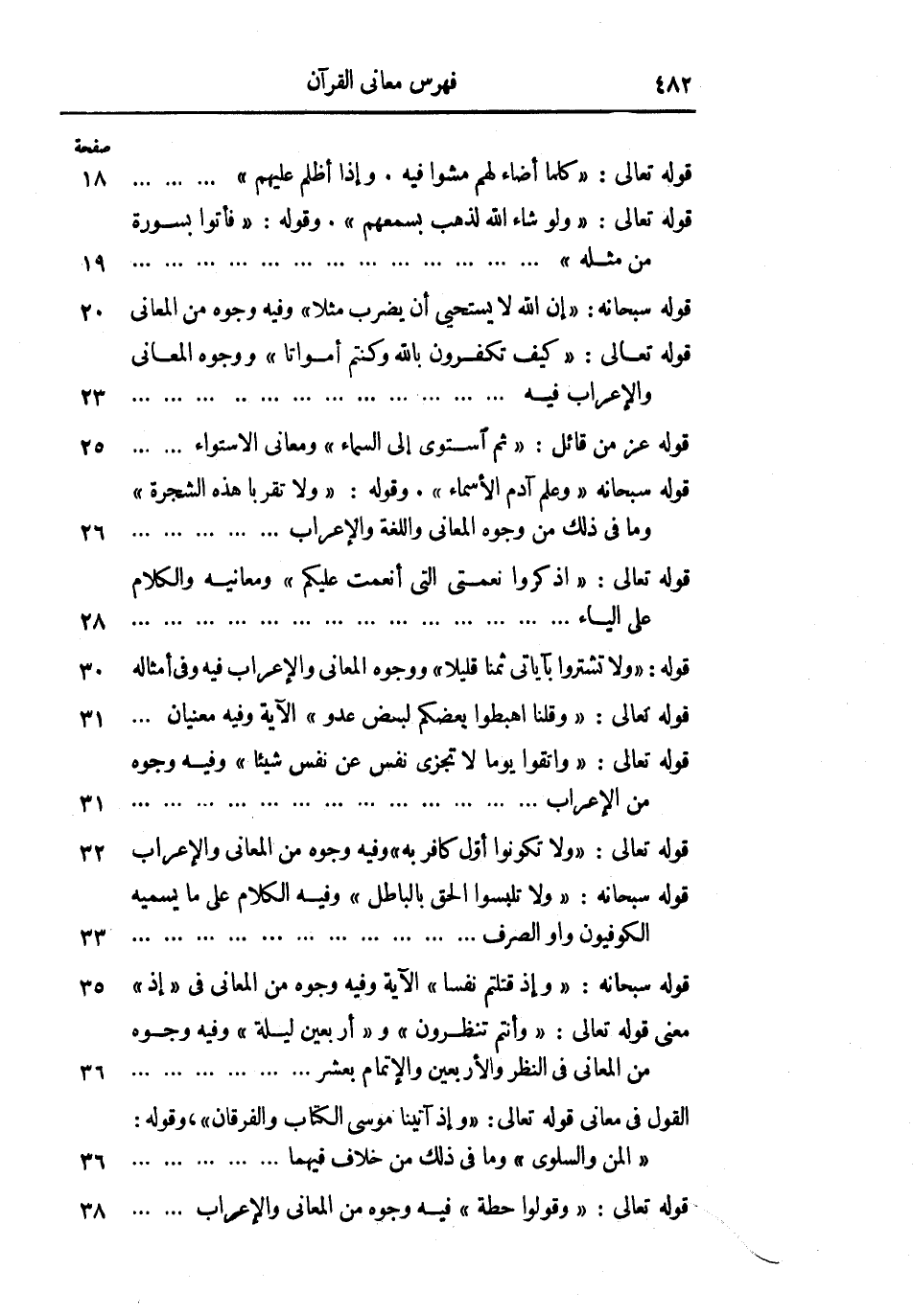 قوله تعالى: «كُلَّما أَضاءَ لَهُمْ مَشَوْا فِيهِ. وَإِذا أَظْلَمَ عَلَيْهِمْ» 18 قوله تعالى: «وَلَوْ شاءَ اللَّهُ لَذَهَبَ بِسَمْعِهِمْ» . وقوله: «فَأْتُوا بِسُورَةٍ مِنْ مِثْلِهِ» 19 قوله سبحانه: «إِنَّ اللَّهَ لا يَسْتَحْيِي أَنْ يَضْرِبَ مَثَلًا» وفيه وجوه من المعاني 20 قوله تعالى: «كَيْفَ تَكْفُرُونَ بِاللَّهِ وَكُنْتُمْ أَمْواتاً» ووجوه المعاني والإعراب فيه 23 قوله عز من قائل: «ثُمَّ اسْتَوى إِلَى السَّماءِ» ومعانى الاستواء 25 قوله سبحانه «وَعَلَّمَ آدَمَ الْأَسْماءَ» . وقوله: «وَلا تَقْرَبا هذِهِ الشَّجَرَةَ» وما فى ذلك من وجوه المعاني واللغة والإعراب 26 قوله تعالى: «اذْكُرُوا نِعْمَتِيَ الَّتِي أَنْعَمْتُ عَلَيْكُمْ» ومعانيه والكلام على الياء 28 قوله: «وَلا تَشْتَرُوا بِآياتِي ثَمَناً قَلِيلًا» ووجوه المعاني والإعراب فيه وفى أمثاله 30 قوله تعالى: «وَقُلْنَا اهْبِطُوا بَعْضُكُمْ لِبَعْضٍ عَدُوٌّ» الآية وفيه معنيان 31 قوله تعالى: «وَاتَّقُوا يَوْماً لا تَجْزِي نَفْسٌ عَنْ نَفْسٍ شَيْئاً» وفيه وجوه من الإعراب 31 قوله تعالى: «وَلا تَكُونُوا أَوَّلَ كافِرٍ بِهِ» وفيه وجوه من المعاني والإعراب 32 قوله سبحانه: «وَلا تَلْبِسُوا الْحَقَّ بِالْباطِلِ» وفيه الكلام على ما يسميه الكوفيون واو الصرف 33 قوله سبحانه: «وَإِذْ قَتَلْتُمْ نَفْساً» الآية وفيه وجوه من المعاني فى «إِذْ» 35 معنى قوله تعالى: «وَأَنْتُمْ تَنْظُرُونَ» و «أَرْبَعِينَ لَيْلَةً» وفيه وجوه من المعاني فى النظر والأربعين والإتمام بعشر 36 القول فى معانى قوله تعالى: «وَإِذْ آتَيْنا مُوسَى الْكِتابَ وَالْفُرْقانَ» ، وقوله: