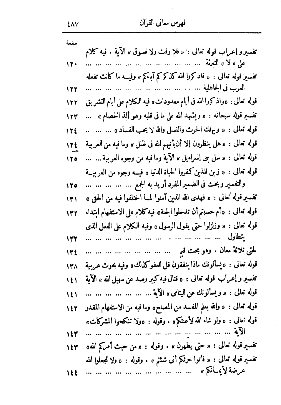 تفسير وإعراب قوله تعالى: «فَلا رَفَثَ وَلا فُسُوقَ» الآية. فيه كلام على «لا» التبرئة 120 تفسير قوله تعالى: «فَاذْكُرُوا اللَّهَ كَذِكْرِكُمْ آباءَكُمْ» وفيه ما كانت تفعله العرب فى الجاهلية 122 قوله تعالى: «وَاذْكُرُوا اللَّهَ فِي أَيَّامٍ مَعْدُوداتٍ» فيه الكلام على أيام التشريق 122 تفسير قوله سبحانه: «وَيُشْهِدُ اللَّهَ عَلى ما فِي قَلْبِهِ وَهُوَ أَلَدُّ الْخِصامِ» 123 قوله تعالى: «وَيُهْلِكَ الْحَرْثَ وَالنَّسْلَ وَاللَّهُ لا يُحِبُّ الْفَسادَ» 124 قوله تعالى: «هَلْ يَنْظُرُونَ إِلَّا أَنْ يَأْتِيَهُمُ اللَّهُ فِي ظُلَلٍ» وما فيه من العربية 124 قوله تعالى: «سَلْ بَنِي إِسْرائِيلَ» الآية وما فيه من وجوه العربية 125 قوله تعالى: «زُيِّنَ لِلَّذِينَ كَفَرُوا الْحَياةُ الدُّنْيا» فيه وجوه من العربية والتفسير وبحث فى الضمير المفرد أريد به الجمع 125 تفسير قوله تعالى: «فَهَدَى اللَّهُ الَّذِينَ آمَنُوا لِمَا اخْتَلَفُوا فِيهِ مِنَ الْحَقِّ» 131 قوله تعالى: «أَمْ حَسِبْتُمْ أَنْ تَدْخُلُوا الْجَنَّةَ» فيه كلام على الاستفهام ابتداء 132 قوله تعالى: «وَزُلْزِلُوا حَتَّى يَقُولَ الرَّسُولُ» وفيه الكلام على الفعل الذي يتطاول 132 لحتى ثلاثة معان. وهو بحث قيم 134 قوله تعالى: «يَسْئَلُونَكَ ماذا يُنْفِقُونَ قُلِ الْعَفْوَ كَذلِكَ» وفيه بحوث عربية 138 تفسير وإعراب قوله تعالى: «قِتالٌ فِيهِ كَبِيرٌ وَصَدٌّ عَنْ سَبِيلِ اللَّهِ» الآية 141 قوله تعالى: «وَيَسْئَلُونَكَ عَنِ الْيَتامى» الآية 141 قوله تعالى: «وَاللَّهُ يَعْلَمُ الْمُفْسِدَ مِنَ الْمُصْلِحِ» وما فيه من الاستفهام المقدر 142 قوله تعالى: «وَلَوْ شاءَ اللَّهُ لَأَعْنَتَكُمْ» . وقوله: «وَلا تَنْكِحُوا الْمُشْرِكاتِ» الآية 143 تفسير قوله تعالى: «حَتَّى يَطْهُرْنَ» . وقوله: «مِنْ حَيْثُ أَمَرَكُمُ اللَّهُ» 143 تفسير قوله تعالى: «فَأْتُوا حَرْثَكُمْ أَنَّى شِئْتُمْ» . وقوله: «وَلا تَجْعَلُوا اللَّهَ عُرْضَةً لِأَيْمانِكُمْ» 144
