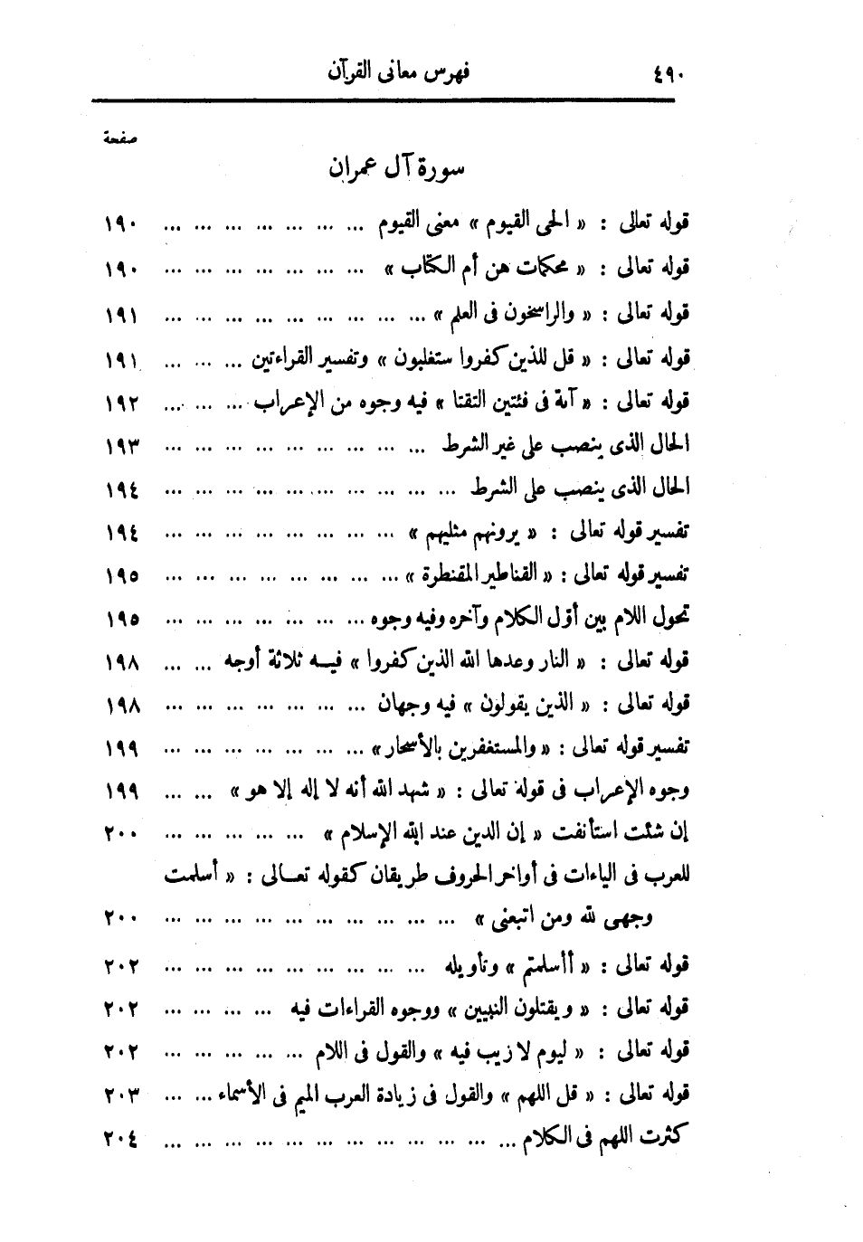 تعالى: «الْحَيُّ الْقَيُّومُ» معنى القيوم 190 قوله تعالى: «مُحْكَماتٌ هُنَّ أُمُّ الْكِتابِ» 190 قوله تعالى: «وَالرَّاسِخُونَ فِي الْعِلْمِ» 191 قوله تعالى: «قُلْ لِلَّذِينَ كَفَرُوا سَتُغْلَبُونَ» وتفسير القراءتين 191 قوله تعالى: «آيَةٌ فِي فِئَتَيْنِ الْتَقَتا» فيه وجوه من الإعراب 192 الحال الذي ينصب على غير الشرط 193 الحال الذي ينصب على الشرط 194 تفسير قوله تعالى: «يَرَوْنَهُمْ مِثْلَيْهِمْ» 194 تفسير قوله تعالى: «الْقَناطِيرِ الْمُقَنْطَرَةِ» 195 تحول اللام بين أوّل الكلام وآخره وفيه وجوه 195 قوله تعالى: «النَّارُ وَعَدَهَا اللَّهُ الَّذِينَ كَفَرُوا» فيه ثلاثة أوجه 198 قوله تعالى: «الَّذِينَ يَقُولُونَ» فيه وجهان 198 تفسير قوله تعالى: «وَالْمُسْتَغْفِرِينَ بِالْأَسْحارِ» 199 وجوه الإعراب فى قوله تعالى: «شَهِدَ اللَّهُ أَنَّهُ لا إِلهَ إِلَّا هُوَ» 199 إن شئت استأنفت «إِنَّ الدِّينَ عِنْدَ اللَّهِ الْإِسْلامُ» 200 للعرب فى الياءات فى أواخر الحروف طريقان كقوله تعالى: «أَسْلَمْتُ وَجْهِيَ لِلَّهِ وَمَنِ اتَّبَعَنِ» 200 قوله تعالى: «أَأَسْلَمْتُمْ» وتأويله 202 قوله تعالى: «وَيَقْتُلُونَ النَّبِيِّينَ» ووجوه القراءات فيه 202 قوله تعالى: «لِيَوْمٍ لا رَيْبَ فِيهِ» والقول فى اللام 202 قوله تعالى: «قُلِ اللَّهُمَّ» والقول فى زيادة العرب الميم فى الأسماء 203 كثرت اللهم فى الكلام 204