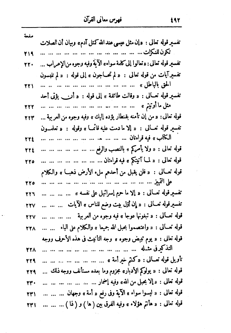 تفسير قوله تعالى: «إِنَّ مَثَلَ عِيسى عِنْدَ اللَّهِ كَمَثَلِ آدَمَ» وبيان أن الصلات تكون للنكرات 219 تفسير قوله تعالى: «تَعالَوْا إِلى كَلِمَةٍ سَواءٍ» الآية وفيه وجوه من الإعراب 220 تفسير آيات من قوله تعالى: «لِمَ تُحَاجُّونَ» إلى قوله: «لِمَ تَلْبِسُونَ الْحَقَّ بِالْباطِلِ» 221 تفسير قوله تعالى: «وَقالَتْ طائِفَةٌ» إلى قوله: «أَنْ يُؤْتى أَحَدٌ مِثْلَ ما أُوتِيتُمْ» 222 قوله تعالى: «مَنْ إِنْ تَأْمَنْهُ بِقِنْطارٍ يُؤَدِّهِ إِلَيْكَ» وفيه وجوه من العربية 223 تفسير قوله تعالى: «إِلَّا ما دُمْتَ عَلَيْهِ قائِماً» وقوله: «تُعَلِّمُونَ الْكِتابَ» فيه قراءتان 224 قوله تعالى: «وَلا يَأْمُرَكُمْ» بالنصب والرفع 224 قوله تعالى: «لَما آتَيْتُكُمْ» فيه قراءتان 225 قوله تعالى: «فَلَنْ يُقْبَلَ مِنْ أَحَدِهِمْ مِلْءُ الْأَرْضِ ذَهَباً» والكلام على التمييز 225 تفسير قوله تعالى: «إِلَّا ما حَرَّمَ إِسْرائِيلُ عَلى نَفْسِهِ» 226 تفسير قوله تعالى: «إِنَّ أَوَّلَ بَيْتٍ وُضِعَ لِلنَّاسِ» الآيات 227 قوله تعالى: «تَبْغُونَها عِوَجاً» فيه وجوه من العربية 227 قوله تعالى: «وَاعْتَصِمُوا بِحَبْلِ اللَّهِ جَمِيعاً» والكلام على الباء 228 قوله تعالى: «يَوْمَ تَبْيَضُّ وُجُوهٌ» وجه التأنيث فى هذه الأحرف ووجه التذكير فى مثله 228 تأويل قوله تعالى: «كُنْتُمْ خَيْرَ أُمَّةٍ» 229 قوله تعالى: «يُوَلُّوكُمُ الْأَدْبارَ» مجزوم وما بعده مستأنف ووجه ذلك 229 قوله تعالى: «إِلَّا بِحَبْلٍ مِنَ اللَّهِ» وفيه إضمار 230 قوله تعالى: «لَيْسُوا سَواءً» الآية وفى رفع «أُمَّةٌ» وجهان 231 قوله تعالى: «ها أَنْتُمْ هؤُلاءِ» وفيه الفرق بين (ها) و (ذا) 231