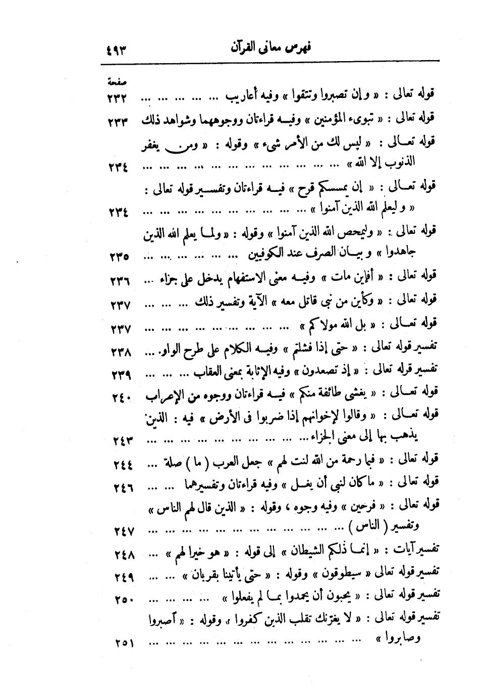 «وَلِيَعْلَمَ اللَّهُ الَّذِينَ آمَنُوا» 234 قوله تعالى: «وَلِيُمَحِّصَ اللَّهُ الَّذِينَ آمَنُوا» وقوله: «وَلَمَّا يَعْلَمِ اللَّهُ الَّذِينَ جاهَدُوا» وبيان الصرف عند الكوفيين 235 قوله تعالى: «أَفَإِنْ ماتَ» وفيه معنى الاستفهام يدخل على جزاء 236 قوله تعالى: «وَكَأَيِّنْ مِنْ نَبِيٍّ قاتَلَ مَعَهُ» الآية وتفسير ذلك 237 قوله تعالى: «بَلِ اللَّهُ مَوْلاكُمْ» 237 تفسير قوله تعالى: «حَتَّى إِذا فَشِلْتُمْ» وفيه الكلام على طرح الواو 238 تفسير قوله تعالى: «إِذْ تُصْعِدُونَ» وفيه الإثابة بمعنى العقاب 239 قوله تعالى: «يَغْشى طائِفَةً مِنْكُمْ» فيه قراءتان ووجوه من الإعراب 240 قوله تعالى: «وَقالُوا لِإِخْوانِهِمْ إِذا ضَرَبُوا فِي الْأَرْضِ» فيه: الذين يذهب بها إلى معنى الجزاء 243 قوله تعالى: «فَبِما رَحْمَةٍ مِنَ اللَّهِ لِنْتَ لَهُمْ» جعل العرب (ما) صلة 244 قوله تعالى: «ما كانَ لِنَبِيٍّ أَنْ يَغُلَّ» وفيه قراءتان وتفسيرهما 246 قوله تعالى: «فَرِحِينَ» وفيه وجوه، وقوله: «الَّذِينَ قالَ لَهُمُ النَّاسُ» وتفسير (الناس) 247 تفسير آيات: «إِنَّما ذلِكُمُ الشَّيْطانُ» إلى قوله: «هُوَ خَيْراً لَهُمْ» 248 تفسير قوله تعالى: «سَيُطَوَّقُونَ» وقوله: «حَتَّى يَأْتِيَنا بِقُرْبانٍ» 249 تفسير قوله تعالى: «يُحِبُّونَ أَنْ يُحْمَدُوا بِما لَمْ يَفْعَلُوا» 250 تفسير قوله تعالى: «لا يَغُرَّنَّكَ تَقَلُّبُ الَّذِينَ كَفَرُوا» وقوله: «اصْبِرُوا وَصابِرُوا» 251