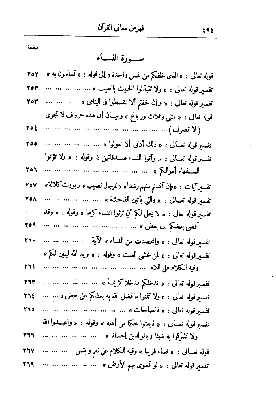 سورة النساء قوله تعالى: «الَّذِي خَلَقَكُمْ مِنْ نَفْسٍ واحِدَةٍ» إلى قوله: «تَسائَلُونَ بِهِ» 252 تفسير قوله تعالى: «وَلا تَتَبَدَّلُوا الْخَبِيثَ بِالطَّيِّبِ» 253 تفسير قوله تعالى: «وَإِنْ خِفْتُمْ أَلَّا تُقْسِطُوا فِي الْيَتامى» 253 قوله تعالى: «مَثْنى وَثُلاثَ وَرُباعَ» وبيان أن هذه حروف لا تجرى (لا تصرف) 254 تفسير قوله تعالى: «ذلِكَ أَدْنى أَلَّا تَعُولُوا» 255 تفسير قوله تعالى: «وَآتُوا النِّساءَ صَدُقاتِهِنَّ» وقوله: «وَلا تُؤْتُوا السُّفَهاءَ أَمْوالَكُمُ» 256 تفسير آيات: «فَإِنْ آنَسْتُمْ مِنْهُمْ رُشْداً» «لِلرِّجالِ نَصِيبٌ» «يُورَثُ كَلالَةً» 257 تفسير قوله تعالى: «وَاللَّاتِي يَأْتِينَ الْفاحِشَةَ» 258 تفسير قوله تعالى: «لا يَحِلُّ لَكُمْ أَنْ تَرِثُوا النِّساءَ كَرْهاً» وقوله: «وَقَدْ أَفْضى بَعْضُكُمْ إِلى بَعْضٍ» 259 تفسير قوله تعالى: «وَالْمُحْصَناتُ مِنَ النِّساءِ» الآية 260 تفسير قوله تعالى: «لِمَنْ خَشِيَ الْعَنَتَ» وقوله: «يُرِيدُ اللَّهُ لِيُبَيِّنَ لَكُمْ» وفيه الكلام على اللام 261 تفسير قوله تعالى: «نُدْخِلْكُمْ مُدْخَلًا كَرِيماً» 263 تفسير قوله تعالى: «وَلا تَتَمَنَّوْا مَا فَضَّلَ اللَّهُ بِهِ بَعْضَكُمْ عَلى بَعْضٍ» 264 تفسير قوله تعالى: «فَالصَّالِحاتُ» 265 تفسير قوله تعالى: «فَابْعَثُوا حَكَماً مِنْ أَهْلِهِ» وقوله: «وَاعْبُدُوا اللَّهَ وَلا تُشْرِكُوا بِهِ شَيْئاً وَبِالْوالِدَيْنِ إِحْساناً» 266 قوله تعالى: «فَساءَ قَرِيناً» وفيه الكلام على نعم وبئس 267 تفسير قوله تعالى: «لَوْ تُسَوَّى بِهِمُ الْأَرْضُ» 269