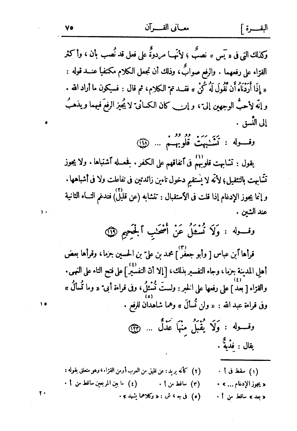 وقوله: وَلا تُسْئَلُ عَنْ أَصْحابِ الْجَحِيمِ (119) قرأها ابن عَبَّاس [وأبو جَعْفَر] «3» مُحَمَّد بْن علىّ بن الحسين جزما، وقرأها بعض أَهْل المدينة جزما، وجاء التفسير بِذَلِك، [إلا أن التفسير «4» ] على فتح التاء على النهى.