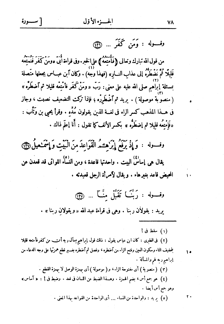(2) فى الطبري: كان ابن عباس يقول: ذلك قول إبراهيم يسأل ربه أن من كفر فأمتعه قليلا بتخفيف التاء وسكون العين وفتح الراء من اضطره، وفصل ثم اضطره بغير قطع همزتها على وجه الدعاء من إبراهيم ربه لهم والمسألة.