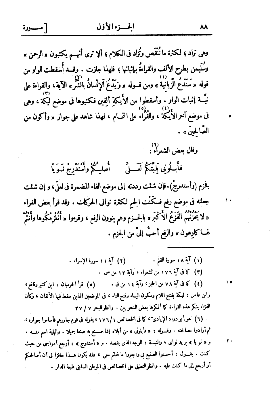 وهي تراد لكثرة ما تنقص وتزاد فِي الكلام ألا ترى أنهم يكتبون «الرحمن» وسليمن بطرح الألف والقراءة بإثباتها فلهذا جازت. وقد أسقطت الواو من قوله «سَنَدْعُ الزَّبانِيَةَ» «1» ومن قوله «وَيَدْعُ الْإِنْسانُ بِالشَّرِّ» «2» الآية، والقراءة على نيَّة إثبات الواو. وأسقطوا من الايكة ألفين فكتبوها فِي موضع ليكة «3» ، وهي فِي موضع آخر الايكة «4» ، والقراء «5» على التمام، فهذا شاهد على جواز «وأكون من الصالحين» .