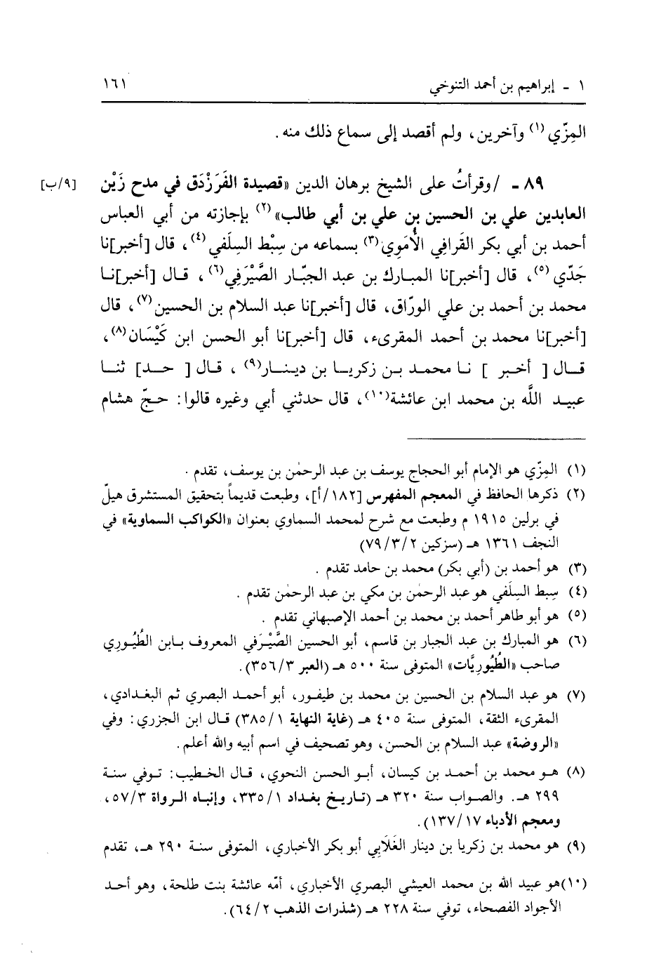 89 - /وقرأت على الشيخ برهان الدين "قصيدة الفرزدق فى مدح زين العابدين على بن الحسين بن على بن أبى طالب" بإجازته من أبى العباس أحمد بن أبى بكر القرافى الأموى بسماعه من سبط السلفي، قال [أخبر] نا جدى، قال [أخبر] نا المبارك بن عبد الجبار الصيرفى، قال [أخبر] نا محمد بن أحمد بن على الوراق، قال [أخبر] نا عبد السلام بن الحسين، قال [أخبر] نا محمد بن أحمد المقرئ، قال [أخبر] نا أبو الحسن ابن كيسان، قال [أخبر] نا محمد بن زكريا بن دينار، قال [حد] ثنا عبيد الله بن محمد ابنن عائشة، قال حدثنى أبى وغيره قالوا: حج هشام