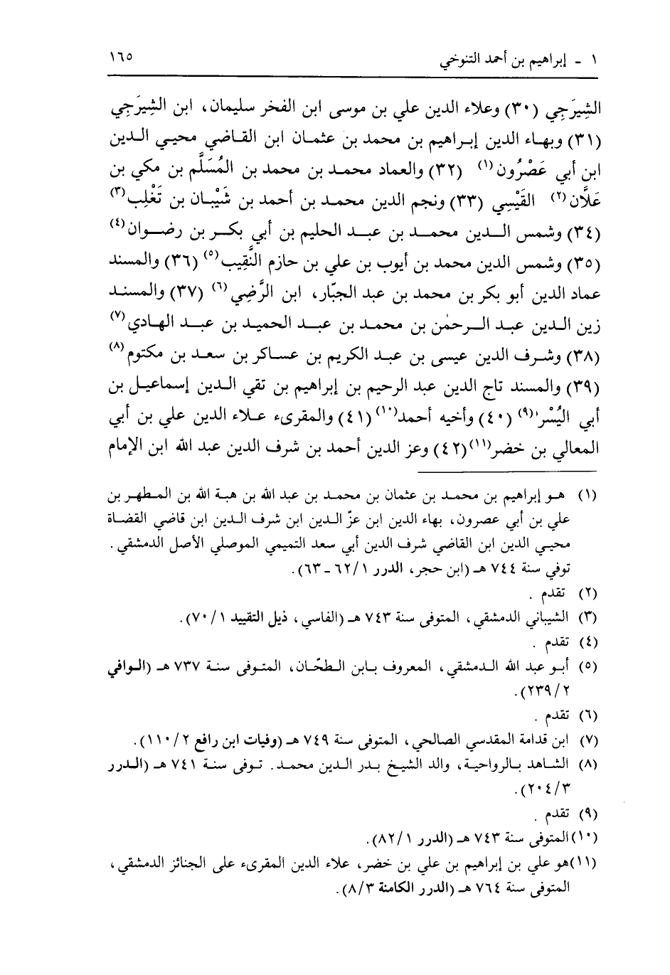 الشيرجي (30) وعلاء الدين على بن موسى ابن الفخر سليمان، ابن الشيرجى (31) وبهاء الدين إبراهيم بن محمد بن عثمان ابن القاضى محيى الدين ابن أبى عصرون (32) والعماد محمد بن محمد بن المسلم بن مكى بن علان القيسى (33) ونجم الدين محمد بن أحمد بن شيبان بن تغلب (34) وشمس الدين محمد بن عبد الحليم بن أبى بكر بن رضوان (35) وشمس الدين محمد بن أيوب بن على بن حازم النقيب (36) والمسند عماد الدين أبو بكر بن محمد بن عبد الجبار، ابن الرضى (37) والمسند زين الدين عبد الرحمن بن محمد بن عبد الحميد بن عبد الهادى (38) وشرف الدين عيسى بن عبد الكريم بن عساكر بن سعد بن مكتوم (39) والمسند تاج الدين عبد الرحيم بن إبراهيم بن تقى الدين إسماعيل بن أبى اليسر (40) وأخيه أحمد (41) والمقرئ علاء الدين على بن أبى المعالى بن خضر (42) وعز الدين أحمد بن شرف الدين عبد الله ابن الإمام