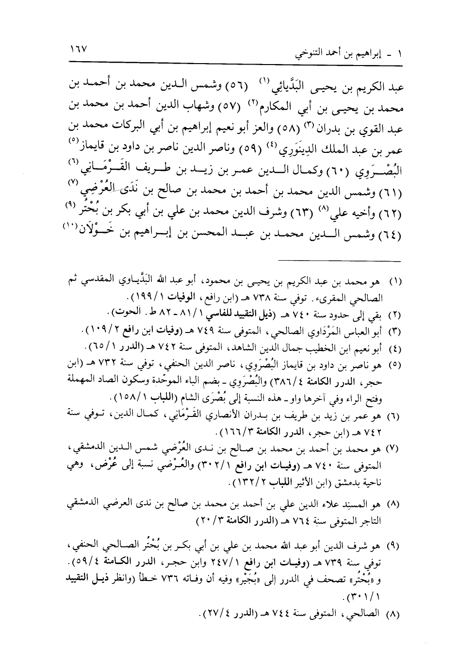 عبد الكريم بن يحيى البديائى (56) وشمس الدين محمد بن أحمد بن محمد بن يحيى بن أبى المكارم (57) وشهاب الدين أحمد بن محمد بن عبد القوى بن بدران (58) والعز أبو نعيم إبراهيم بن أبى البركات محمد بن عمر بن عبد الملك الدينورى (59) وناصر الدين ناصر بن داود بن قايماز البصروى (60) وكمال الدين عمر بن زيد بن طريف القرمانى (61) وشمس الدين محمد بن احمد بن محمد بن صالح بن ندى العرضى (62) وأخيه على (63) وشرف الدين محمد بن على بن أبى بكر بن بحتر (64) وشمس الدين محمد بن عبد المحسن بن إبراهيم بن خولان